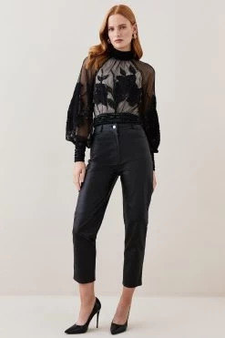 Delicate floral applique details and sequin embellishments define this blouse. Sheer balloon sleeves, lace details and an open back design add a dose of drama to the piece. Style with leather trousers or skirt for an elegant ensemble.