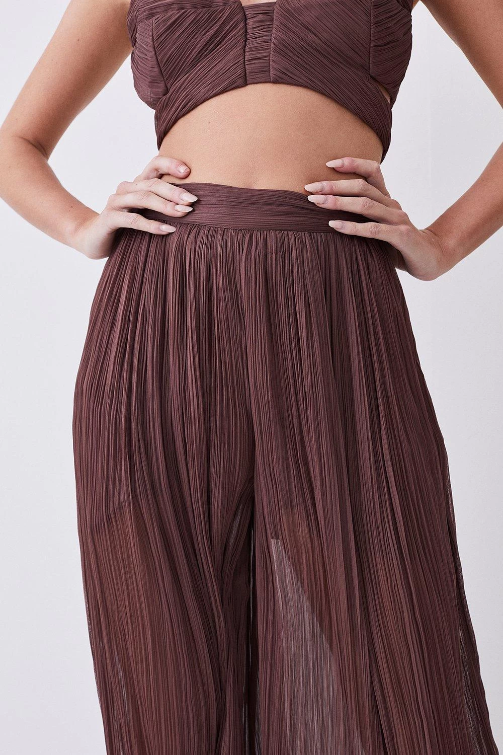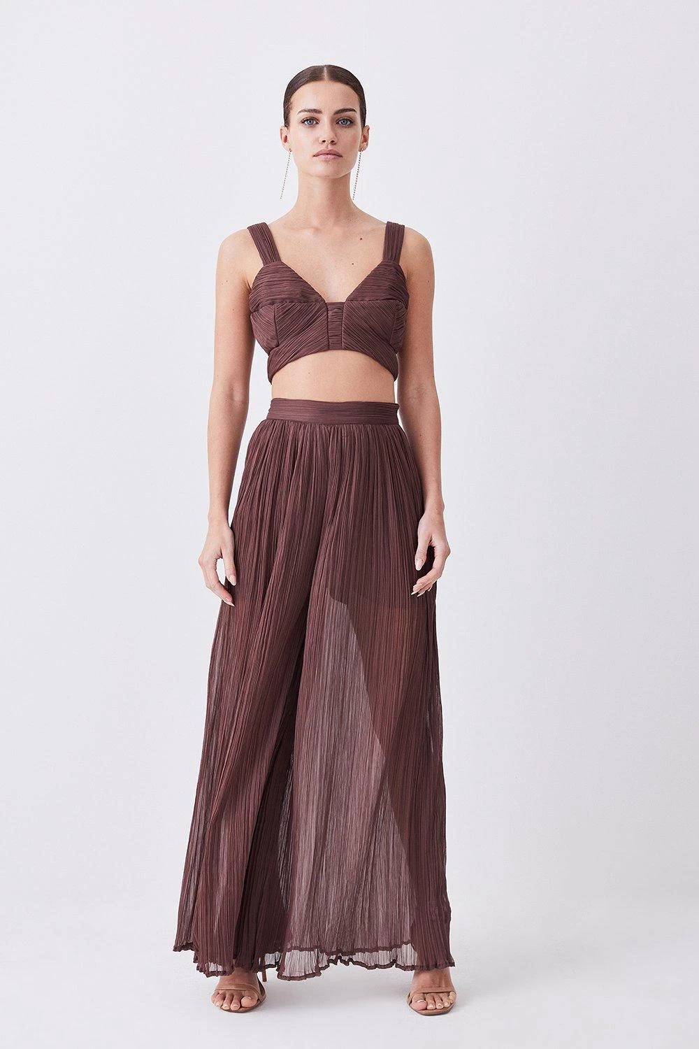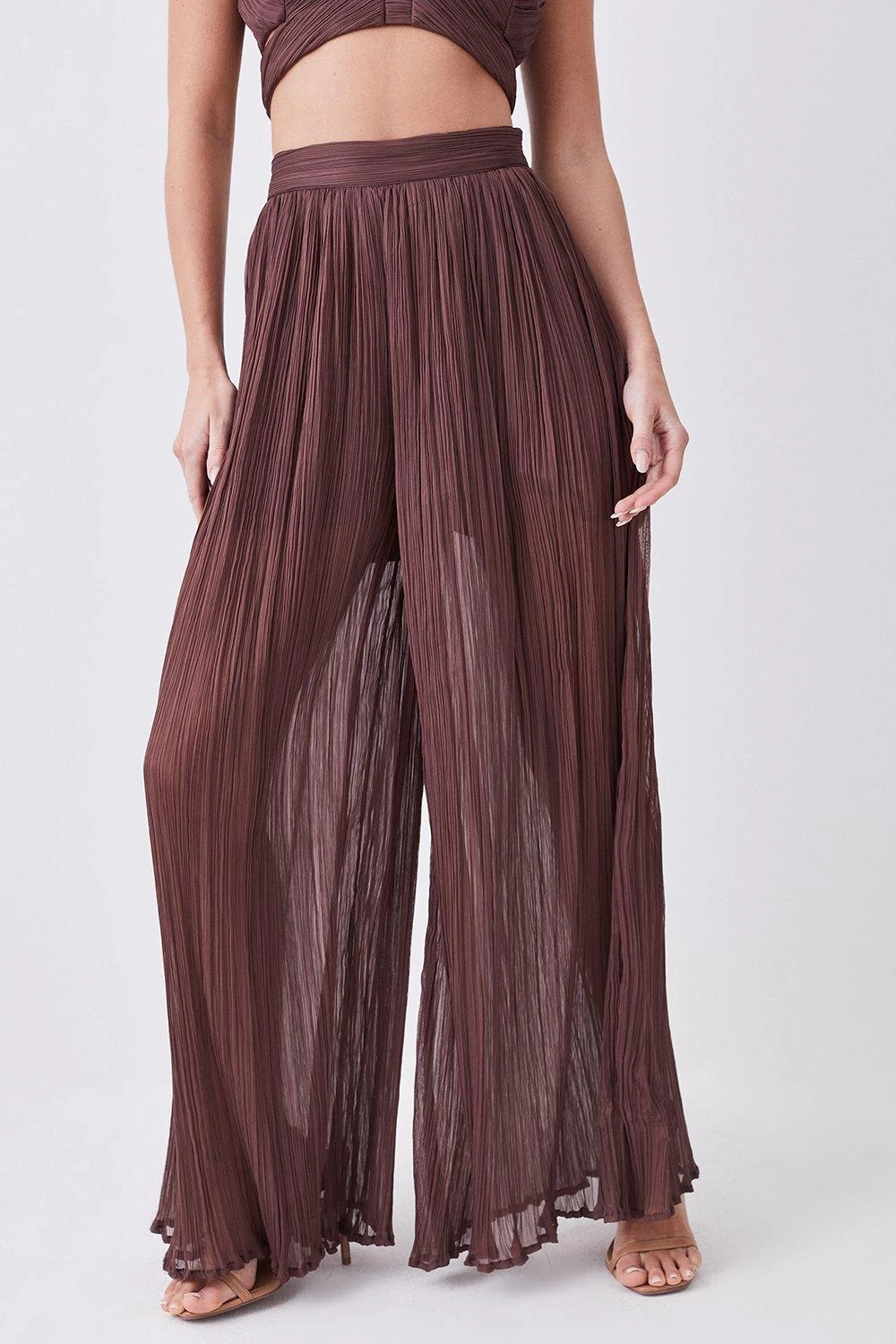Crafted from sumptuous satin chiffon material, these wide-leg trousers are lightweight and breathable, making them the perfect choice for sun-drenched days. Style this pair with the co-ordinating crop top for the ultimate warm weather ensemble.