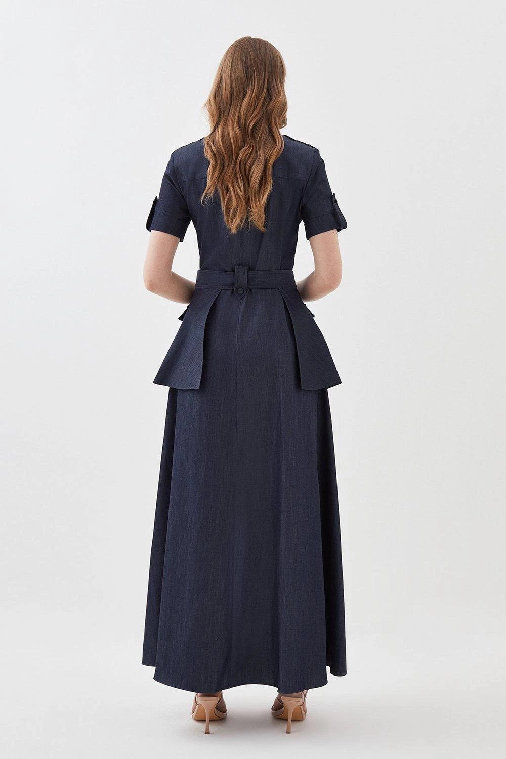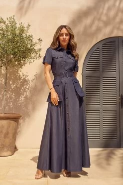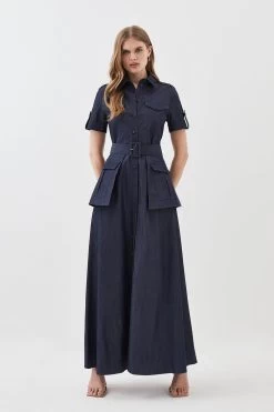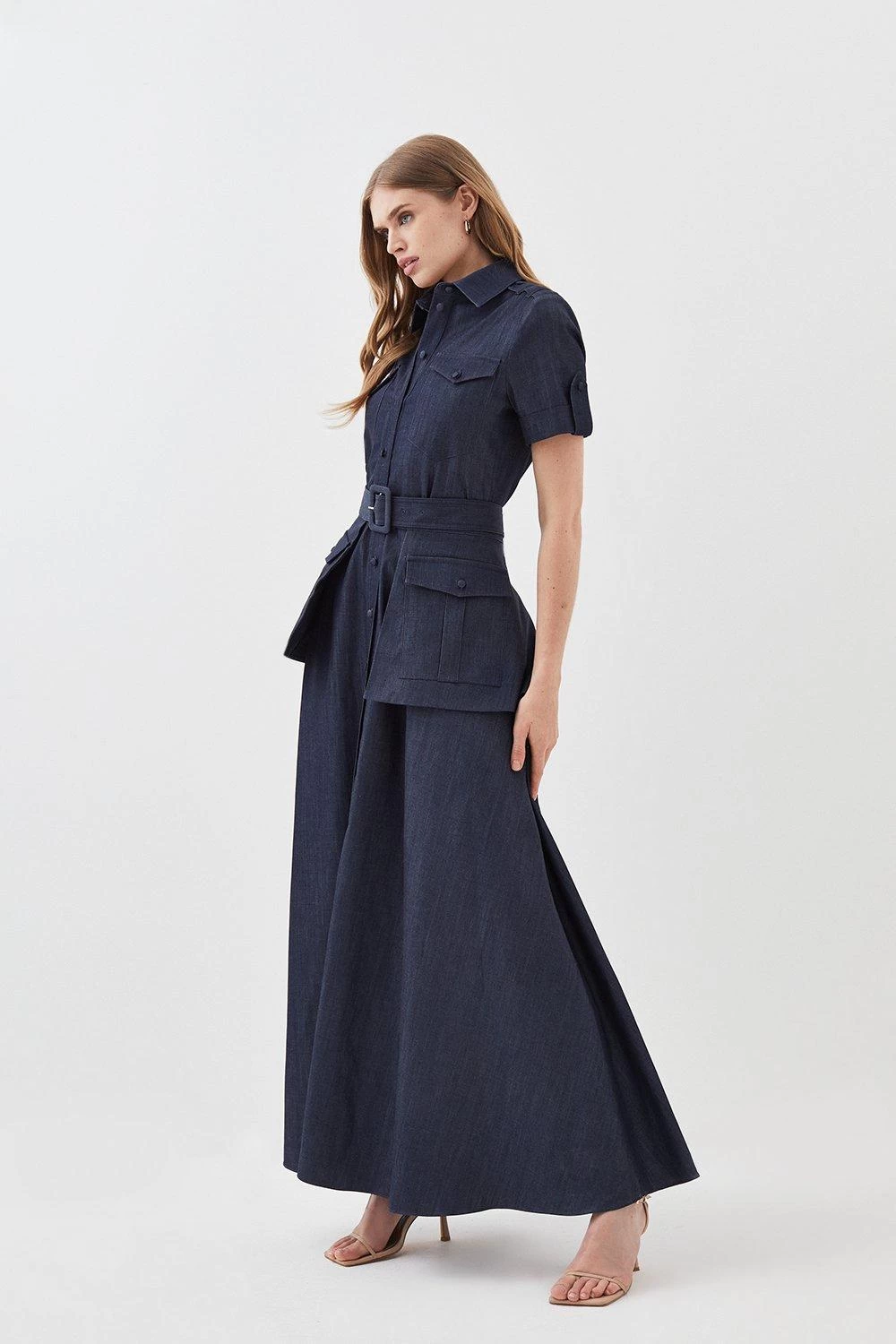 Demonstrate a penchant for directional dressing in this utility shirt dress. This piece is crafted with denim for a fashion-forward update on the classic silhouette. Exaggerated flap pockets add a touch of drama, while a buckle belt subtly cinches the waist.