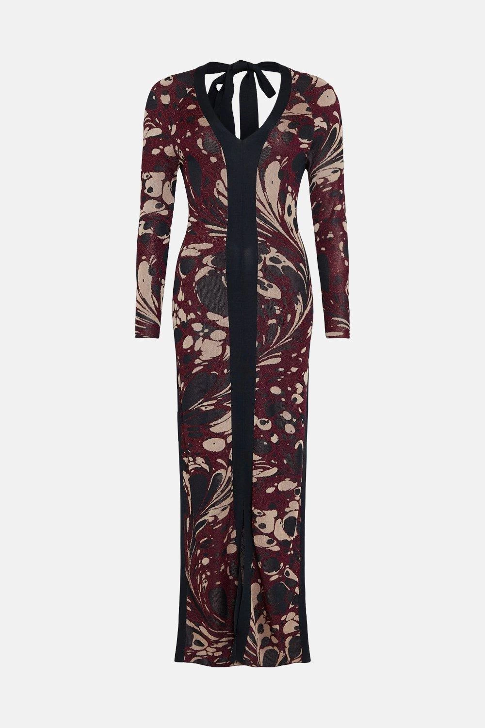 If slinky silhouettes are your forte, look no further. This marble-swirled maxi dress shows off a curve-hugging fit and block black trims to subtly streamline the shape. The classic V-neckline complements a sultry central hem split, back bow closure and dramatic, painterly motif.