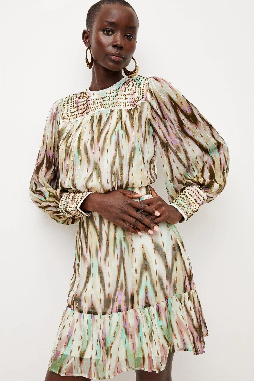 Exuding textural allure, this boldly printed mini dress marries a stylish metallic-flecked motif with Grecian-style metallic beading. It shows off semi-sheer sleeves with gathered cuffs, a cinched-in waist and swishy hemline. Perfect for summer styling, contrast the opulent beads with all-black accessories and statement gold jewellery.