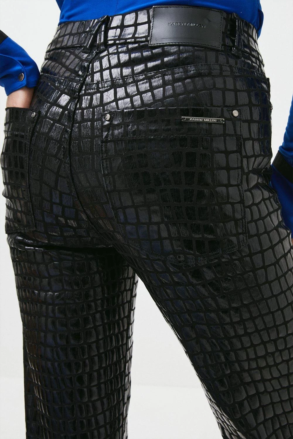 Exude confident flair and an ’80s punk rock influence with these straight leg jeans. Sitting slightly cropped on the leg, the textured croc effect has a patent shine. Slightly higher on the waist, they featured side and back pockets, as well as belt loops. Style it with a simple blouse, or alongside a T-shirt and leather jacket as a more casual alternative.