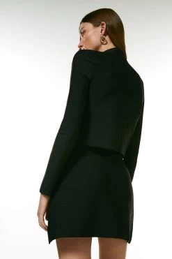 Crafted in a form-fitting bandage knit, this jacket is a super versatile and super flattering piece. Whether worn zipped up or left open, your figure remains beautifully defined. Elevated by luxurious military buttons and textured trims, it adds instant polish to anything you pair it with.