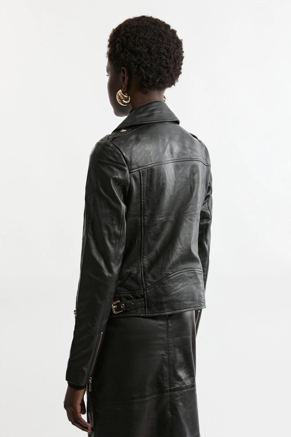 Designed in buttery soft leather,, this jacket is something special. The classic biker styling works harmoniously against its statement double-breasted front. Featuring our signature KM logo and embossed detail, the gold buttons offer an elevated feel to your go-to layer.