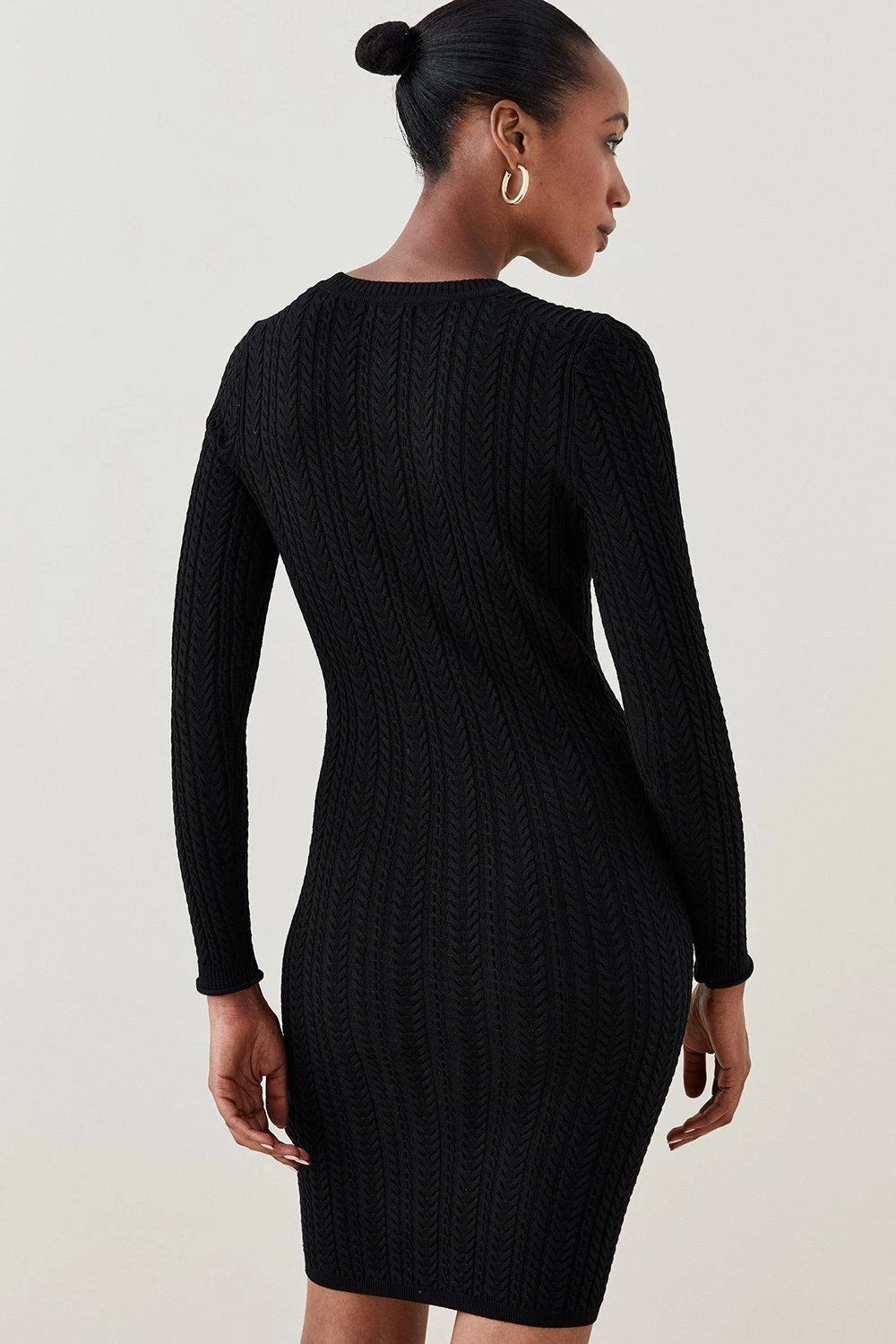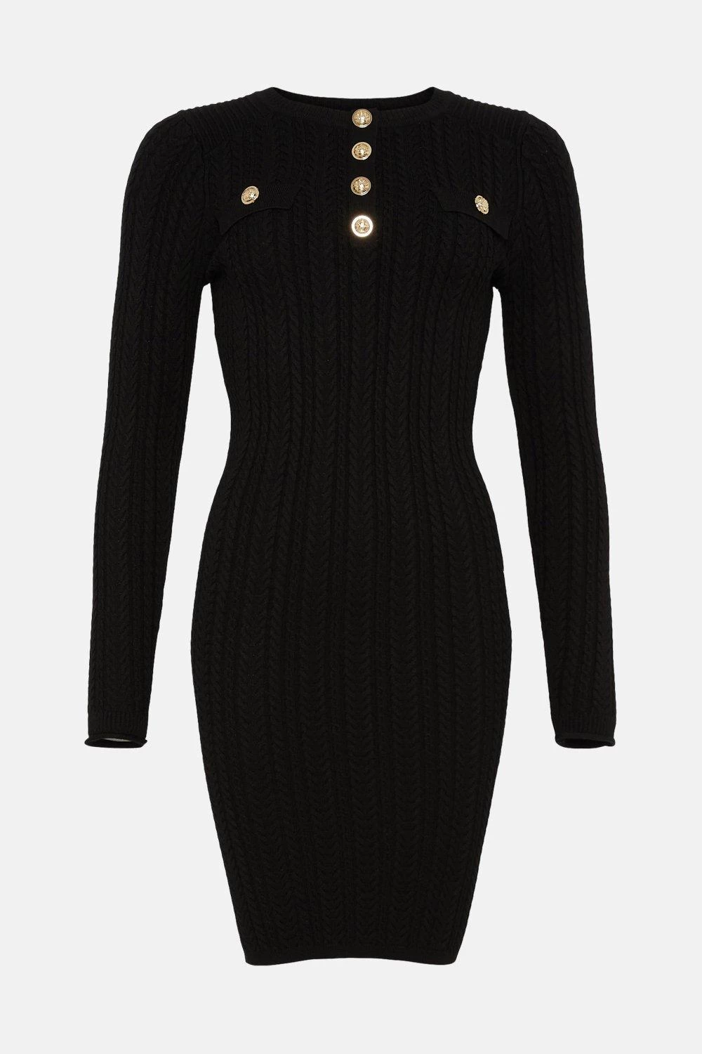 Glossy military-style buttons add a refined finish to this textured cable-knit mini dress. Designed to hug curves in all the right places, it lands at a seductive mini length and features long sleeves with a half button placket and faux chest pockets for a nod to the utility trend.