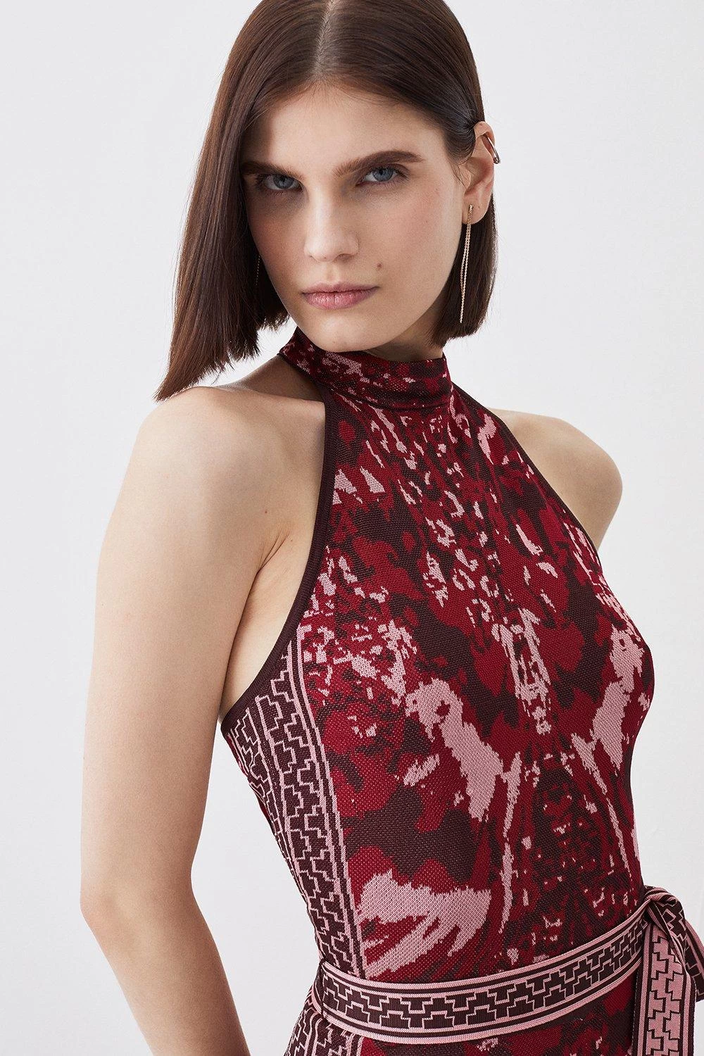 Designed with slinky knit fabric, this jumpsuit effortlessly skims over the silhouette, creating a flattering effect. A vivid mirrored print enhances this one-piece, while a halter neckline naturally calls to summer.