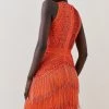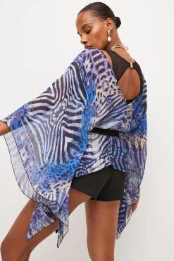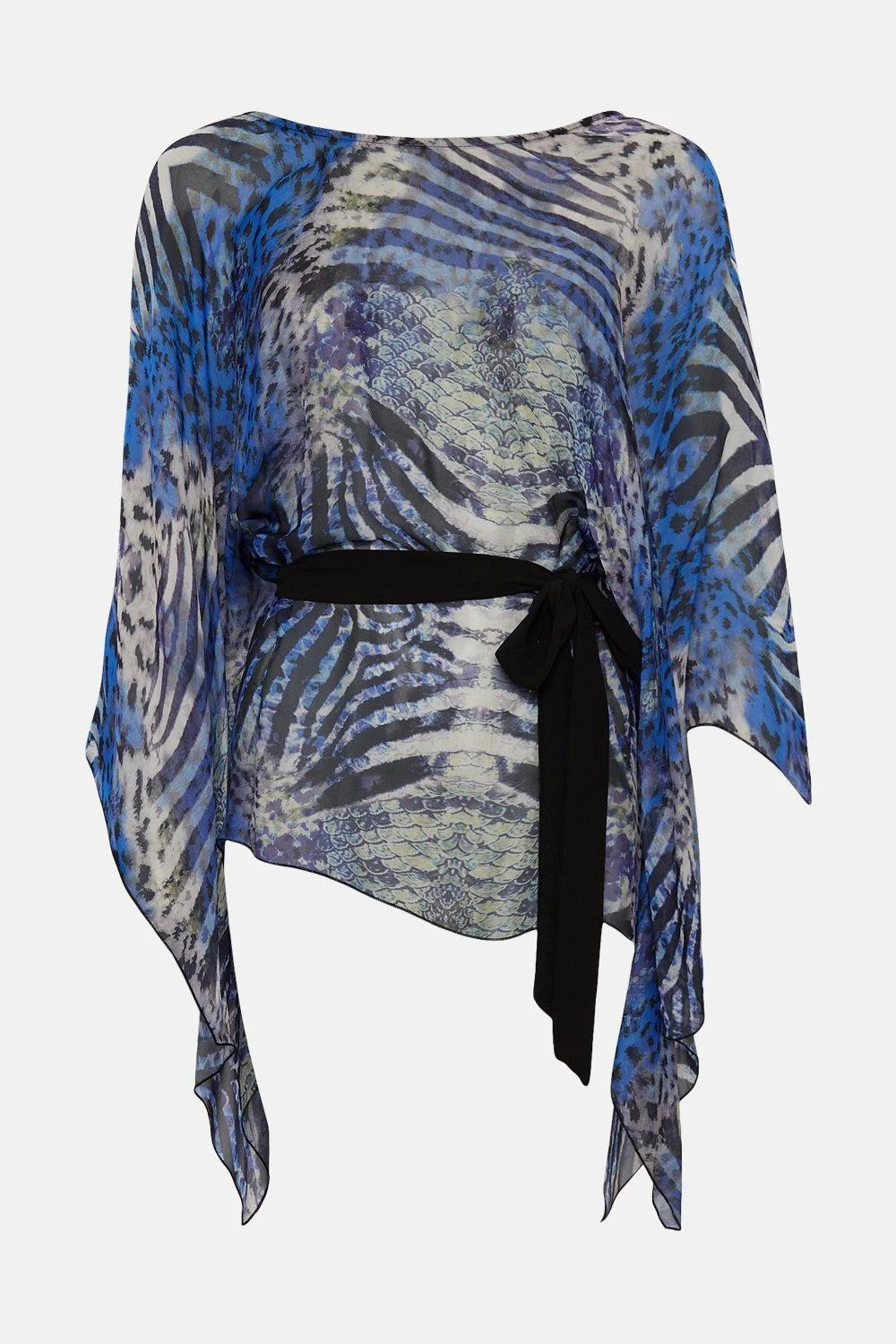 Made for glamorous getaways, this airy kimono top blends statement flared sleeves with a waist-cinching ribbon belt and impactful mirrored zebra print. Balance the trailing silhouette and vibrant colours with tailored black shorts for beachside strolls or a day of city break sightseeing.