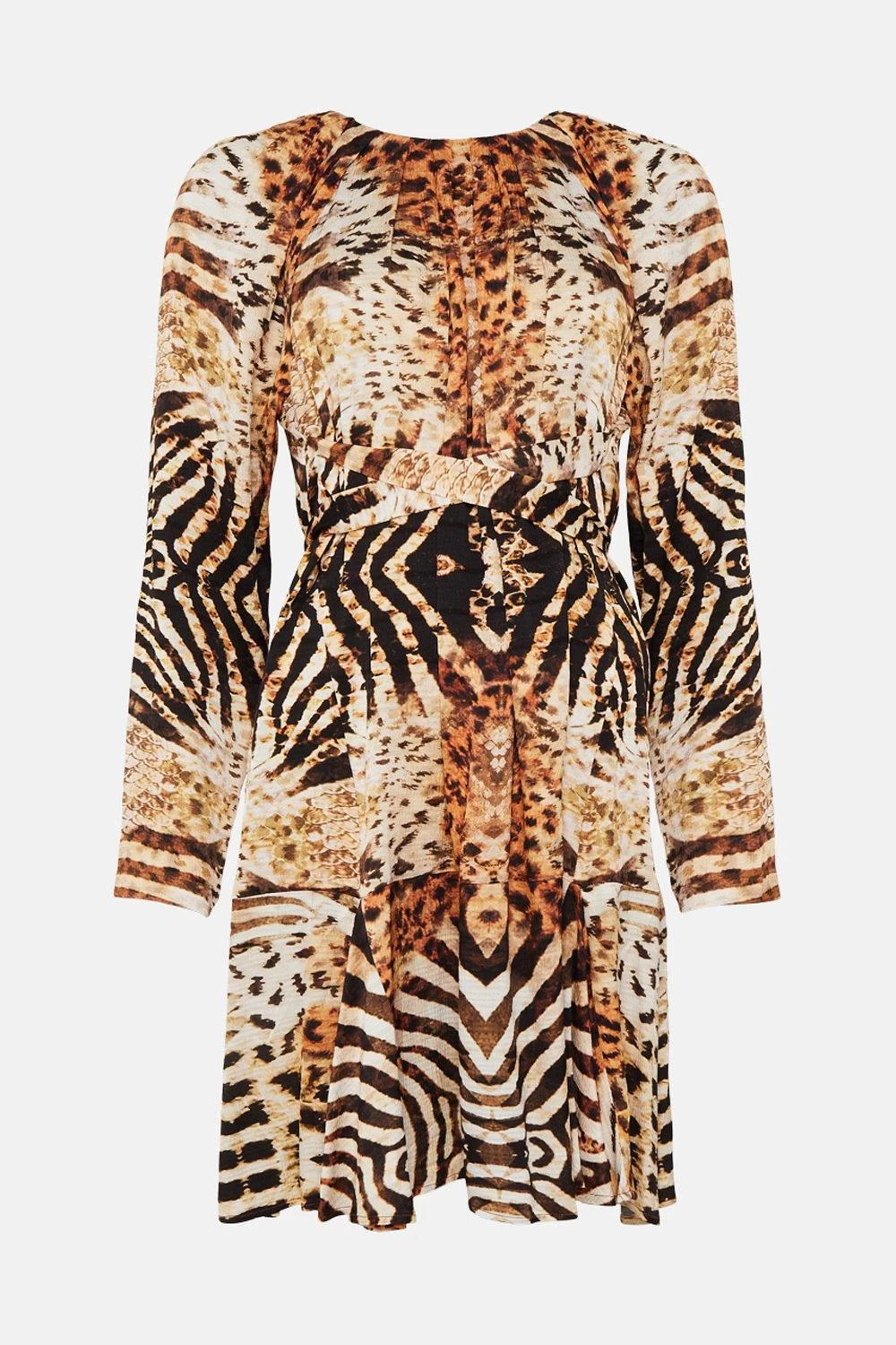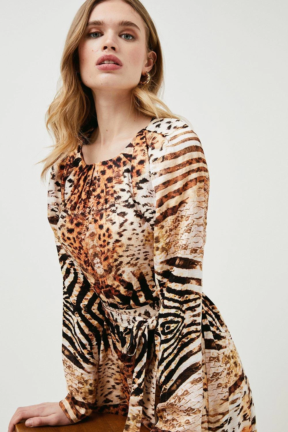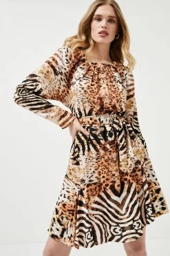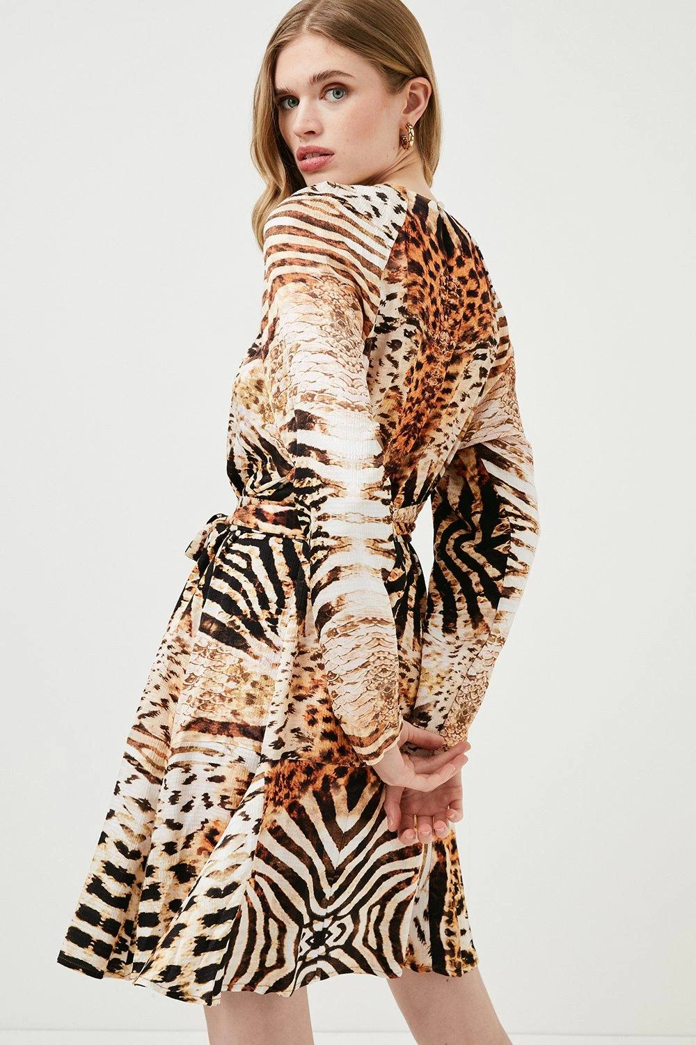 The glamour of animal print is a timeless wardrobe staple, and this modern update makes an instant statement. With a slight puff sleeve detail and cut with a subtly ruched neckline, this flowing satin woven mini dress is cinched at the waist to enhance the form. With an A-line mini skirt, it sits above the knee, an airy warm-weather design that can be dressed down with sandals, or worn of an evening with heels.