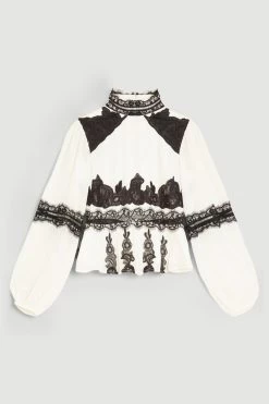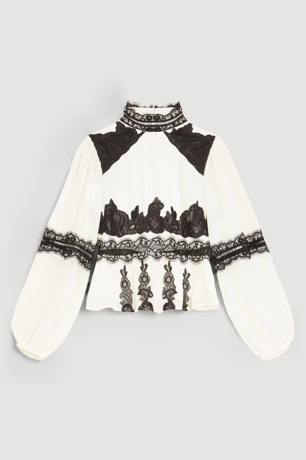 Bringing a sense of opulence to the summer season, this gauzy woven blouse blends delicate lace embroidery with crisp front pleats and romantic balloon sleeves. Spin around to showcase the unexpected back cut-out – a contemporary detail that instantly revives the polished, high-necked silhouette.