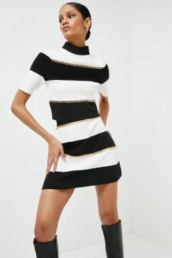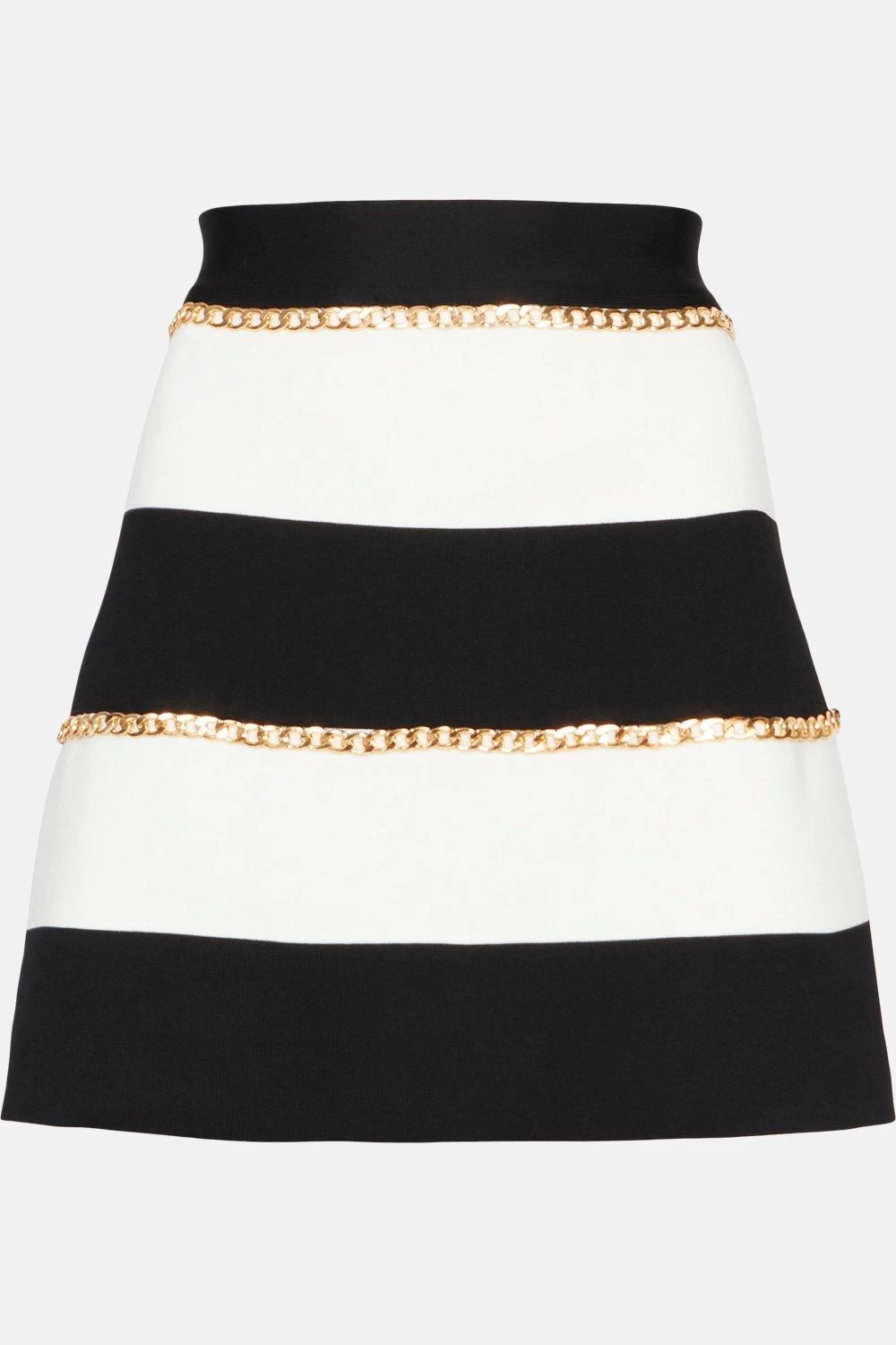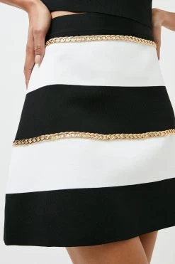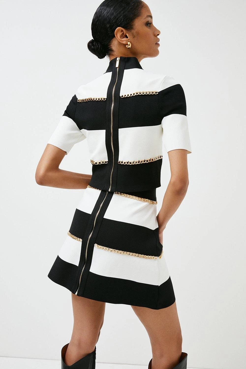 Directional in its off-kilter composition, this mini skirt is a statement-making separate. Imbued with industrial-esque styling, by way of striped detailing lined with curb link chains, pair with the matching top for an ultimately polished effect.