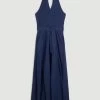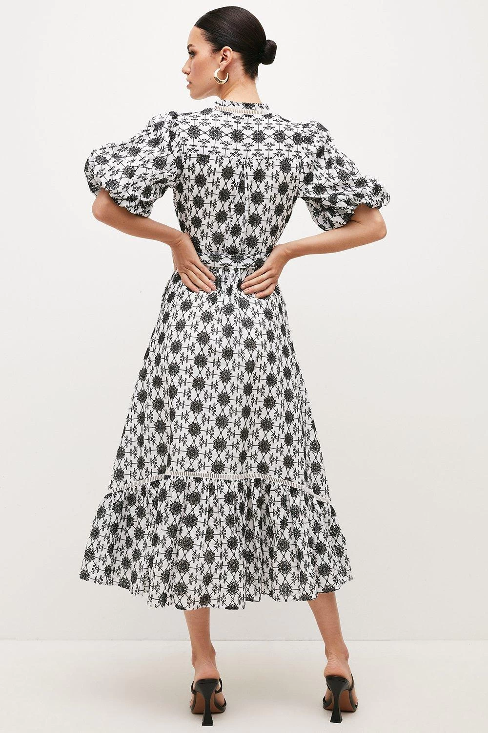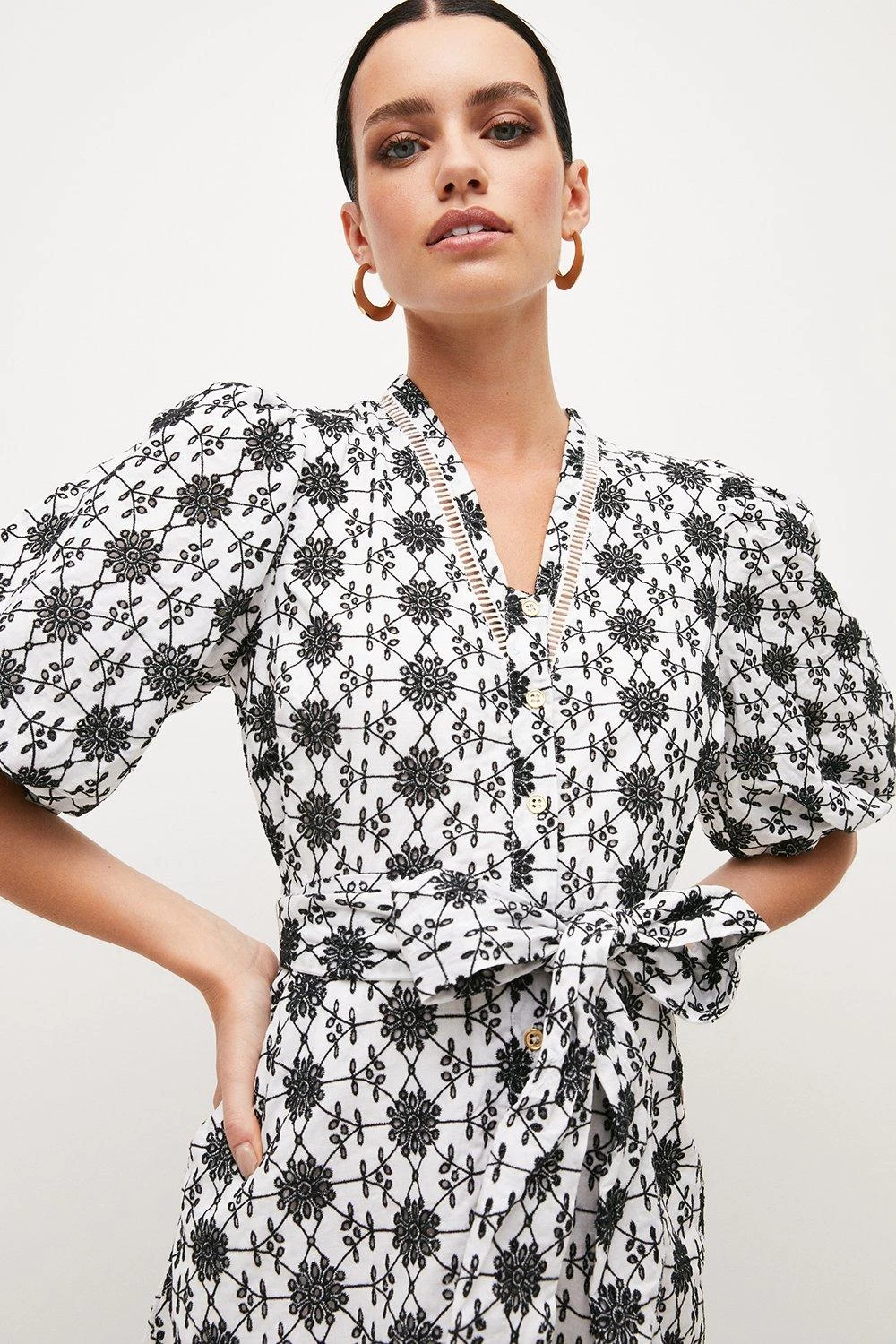 Showcasing a fresh, summery take on monochrome, this organic cotton broderie midi dress has a light, airy feel and ultra-feminine silhouette defined by statement puffed sleeves. Lined with buttons and featuring ladder-stitch trims for a touch of texture, this versatile V-neck piece will soon become your most-loved summer dress. Cinch in the matching belt to show off an hourglass figure beautifully.
