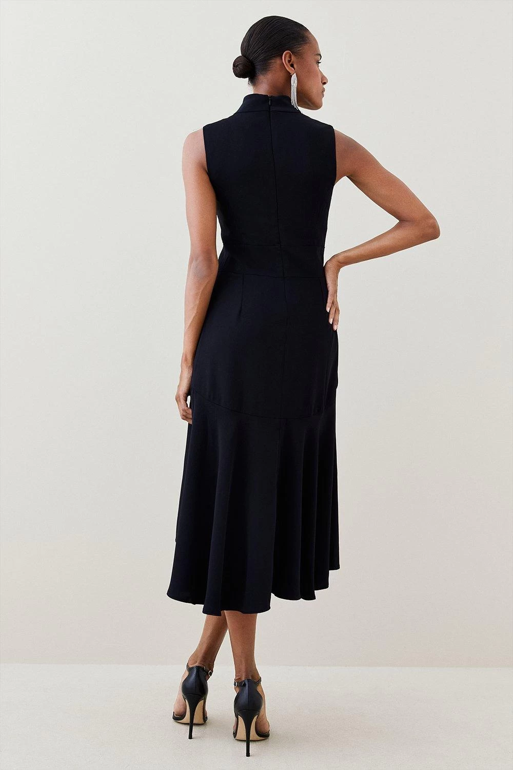 Artfully tailored with a waterfall silhouette, this midi dress balances a high neckline with the fluted dimension of a high-low hem. Perennially polished, pair with streamlined stilettos and glossy accessories.