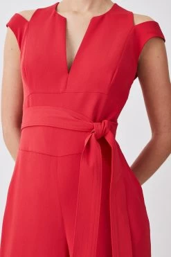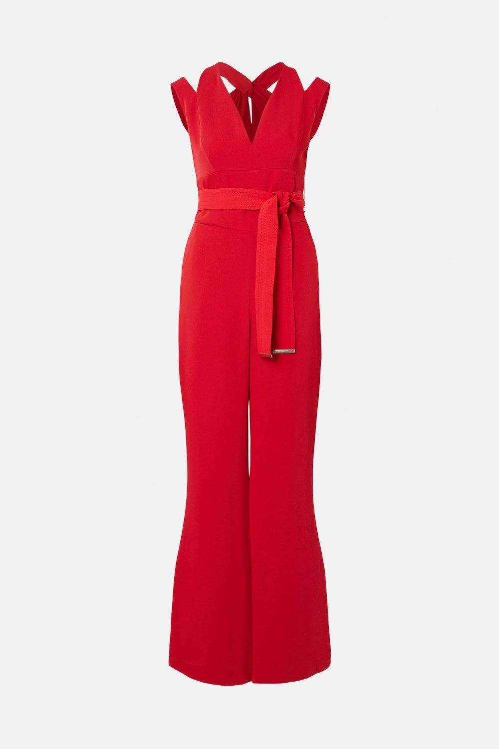 Showcasing a tailored wide-leg silhouette, this one-piece is panelled at the bodice and features a self-tie belt to further define the waist. The design features alluring cut-outs and a twisted-detail back for a unique touch.