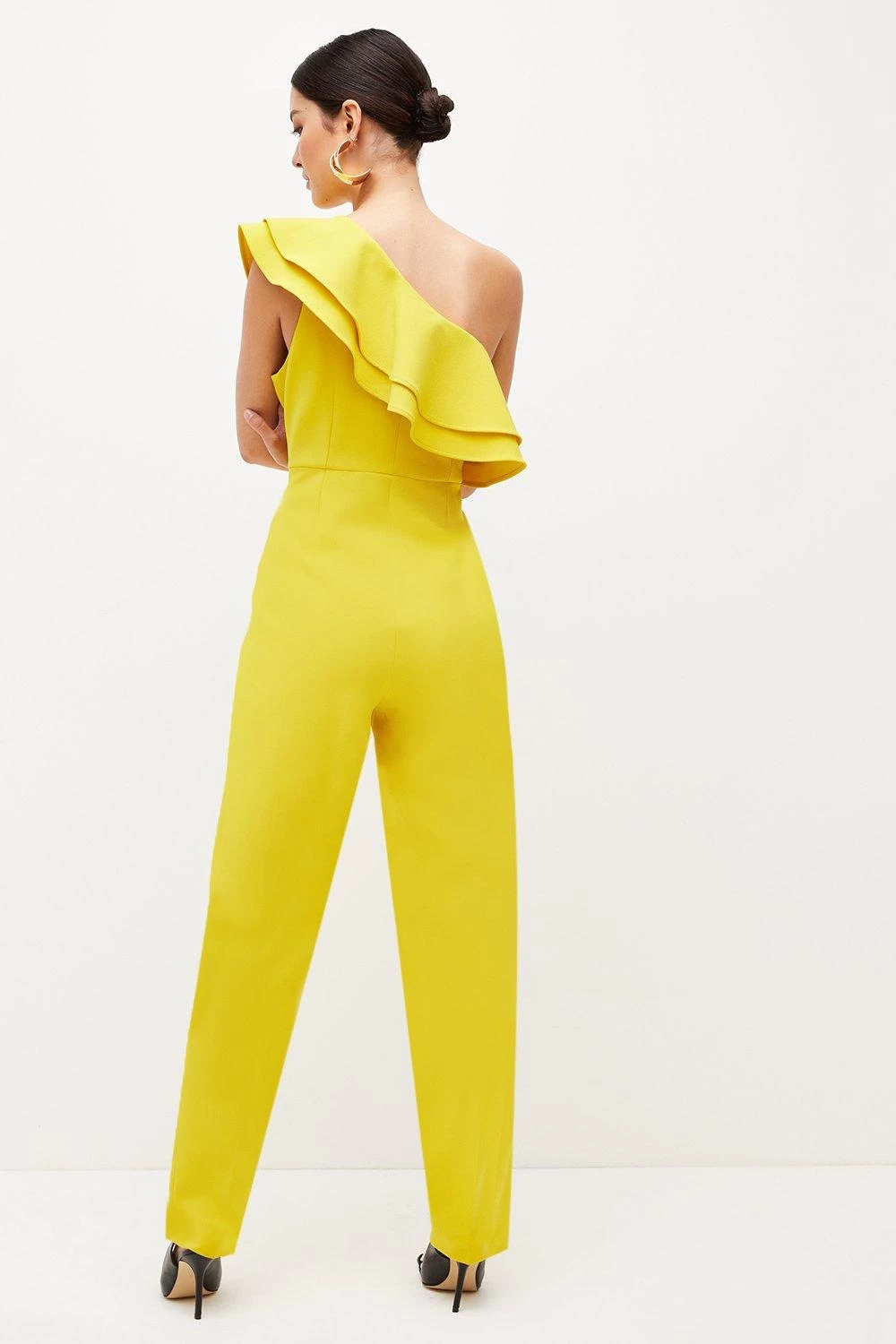Playful ruffles are proportioned with expert balance for this characterful jumpsuit. Defined by a dimensional asymmetric shoulder that calls to sun-kissed skin this season, it has a close fit that defines the waist. Easing into straight legs that are strategically seamed for a flattering fit, pair this one-piece with soaring stilettos and a sunny disposition.