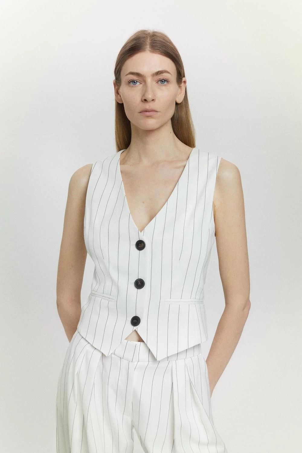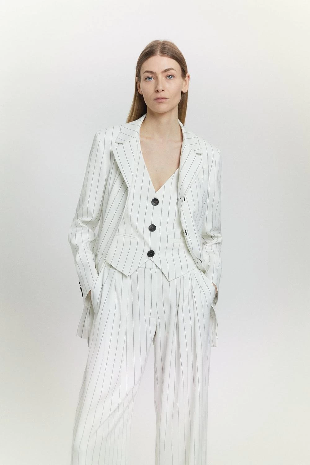 Crafted with contemporary elegance, this piece fits seamlessly into the modern woman’s wardrobe. Taking inspiration from traditional menswear, this waistcoat exudes a directional aesthetic. A pinstripe design adds sharpness, while inseam pockets and signature Karen Millen embossed buttons add a premium finish. Style this piece as a separate or alongside the co-ordinating trousers and blazer.
