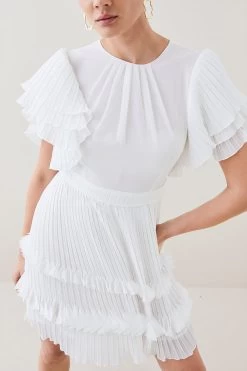 Crafted with layers of pleated lace, this mini dress is truly elegant. A pressed crease bodice adds a sophisticated touch, while angel sleeves add a feminine flourish. Style this dress with sandals and accessories to exude understated elegance at your next spring soiree or garden party.