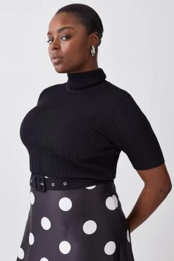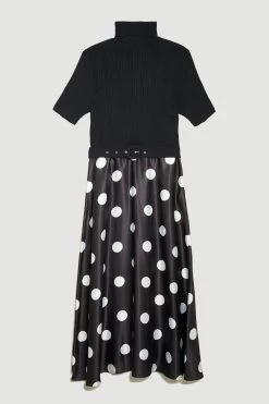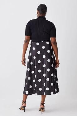 Karen Millen Plus Size Polka Dot Printed Satin Skirt Half Sleeve Rib Knit Midi Dress