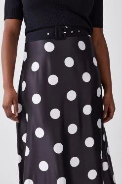 Karen Millen Plus Size Polka Dot Printed Satin Skirt Half Sleeve Rib Knit Midi Dress