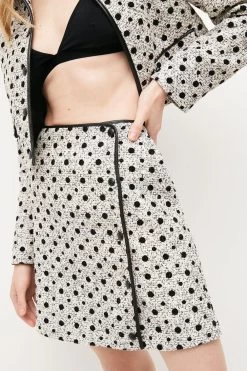 Bring the spirit of the Swinging Sixties into SS22 in this modish cotton-blend mini skirt. Crafted from playful polka dot boucle, its touchable texture is further enhanced by a row of faux leather closures and contrast black piping. Offset the wrap-over front and mini length with a boxy jacket and stacked platforms.