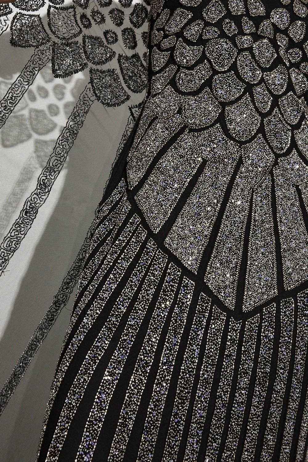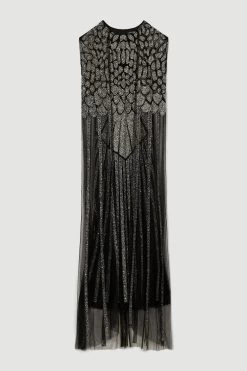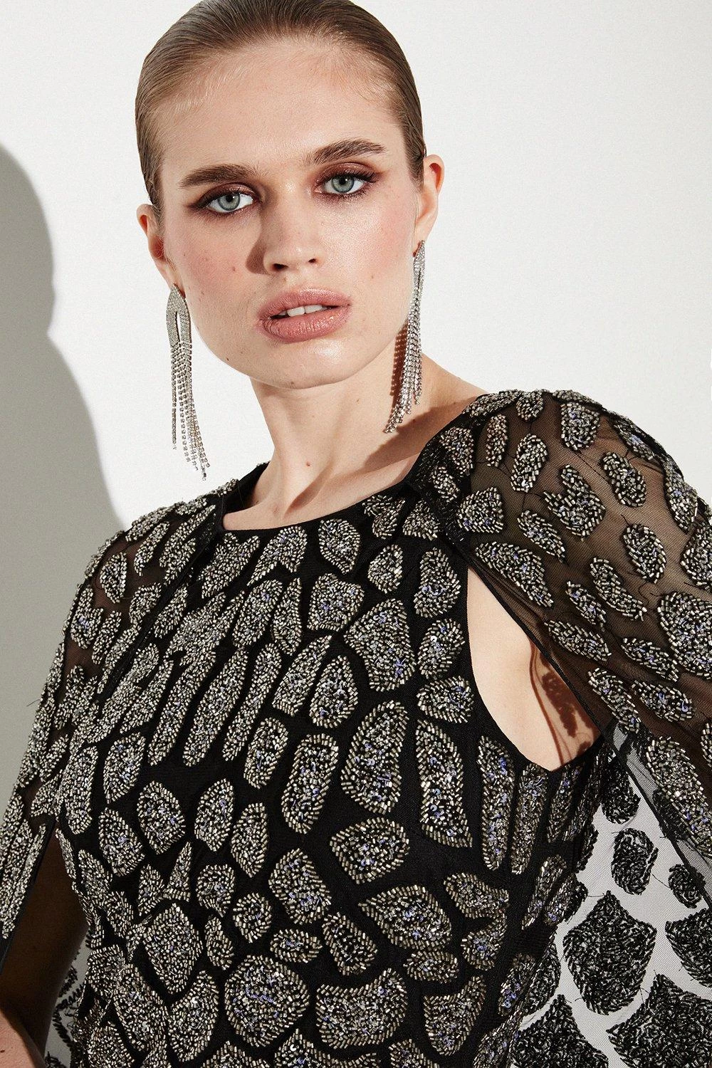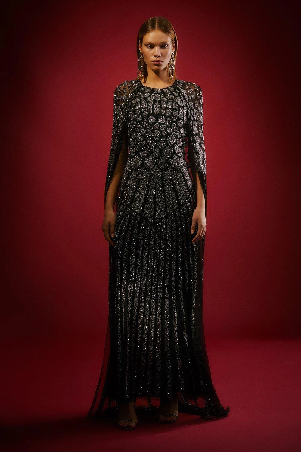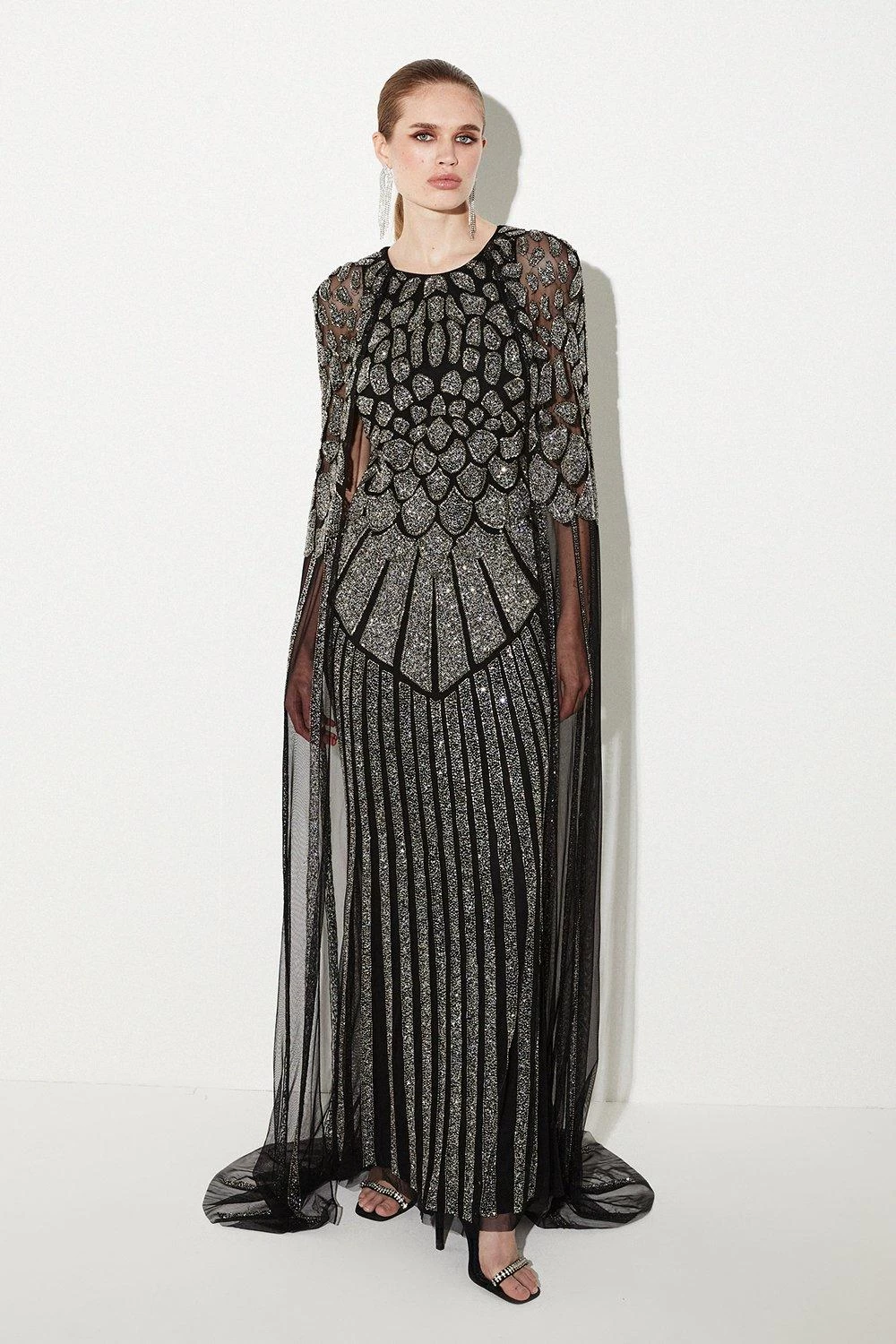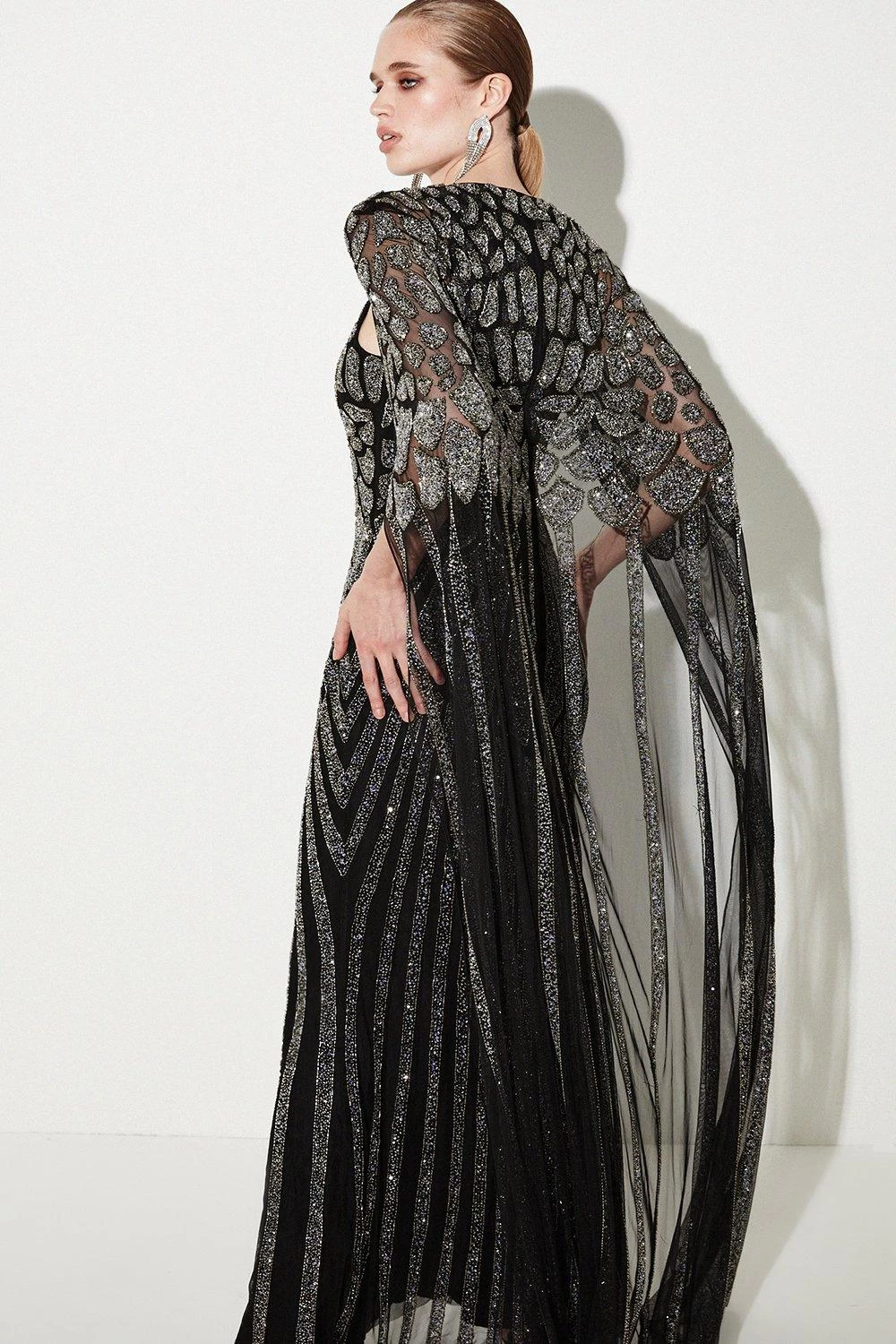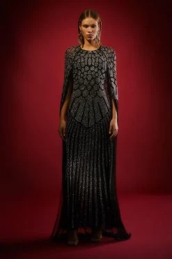 Adorned with an abundance of glistening sequins and beads, this floor-sweeping gown is a vision of ethereal opulence. A cascading cape adds a sense of drama, while mesh details bring an alluring element.