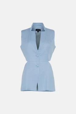 A modern take on the classic tailored waistcoat. Crafted from summer-ready linen for a crisp, natural finish, this clean-lined piece is perfect for warm work days and features edgy side cut-outs, a neat collar and two fabric-covered buttons for a final minimal flourish.