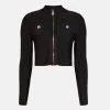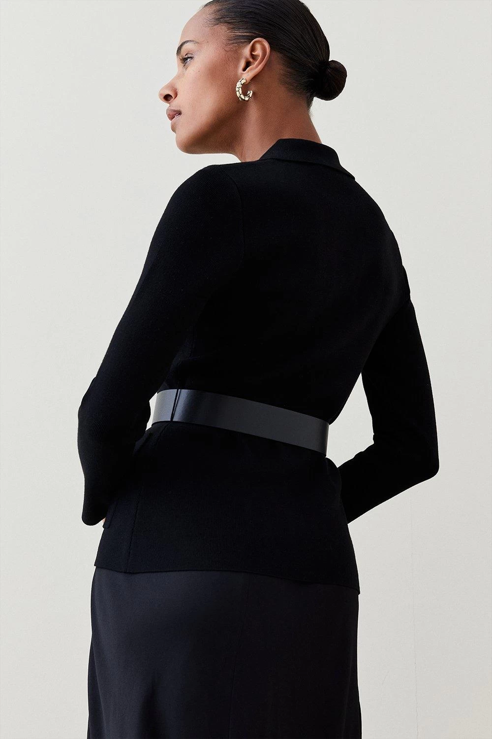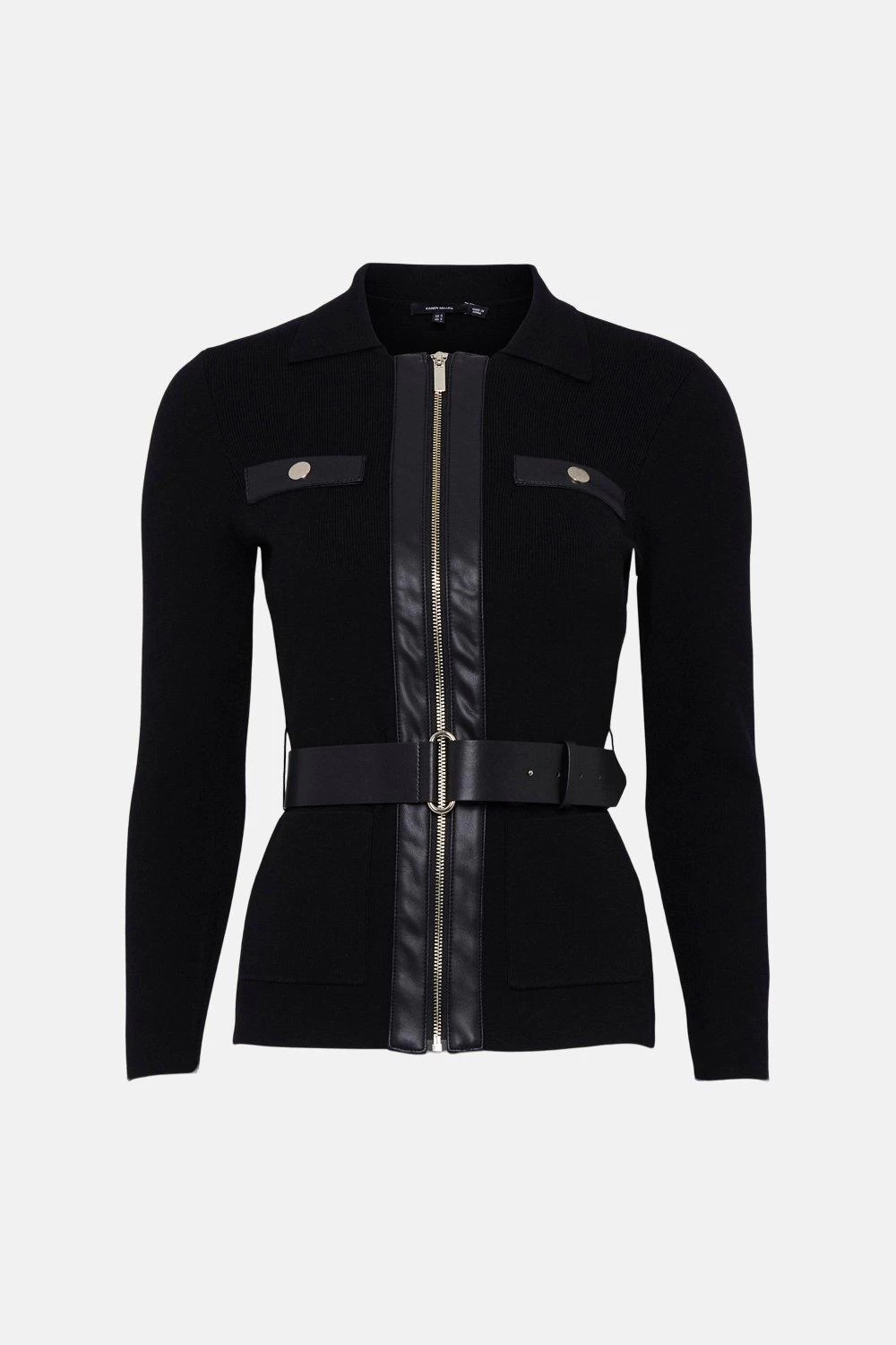 Designed for those who favour a demure sense of style, this luxe knitted jacket features faux leather trims and a front zip for a dash of daring finesse. Cut close to the figure and trimmed with a collar and patch pockets, it blends the practical with the polished. Tighten the utilitarian buckled belt to cinch in your waist when layering it over a ladylike pencil skirt.