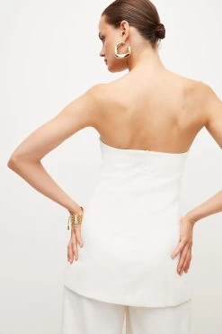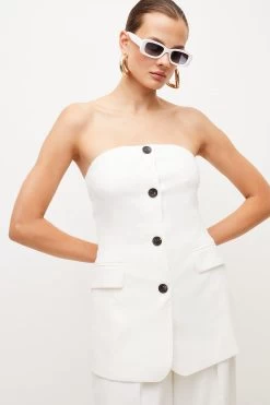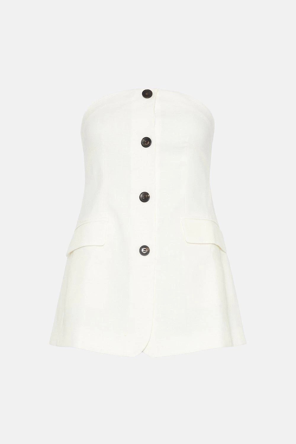 Safari meets Riviera style. This buttoned bandeau bodice top cuts a clean-lined silhouette complete with flap pocket detailing and a longline fit. Perfect for showing off sun-kissed shoulders, it layers beautifully over tailored wide-leg trousers for a unique holiday look.