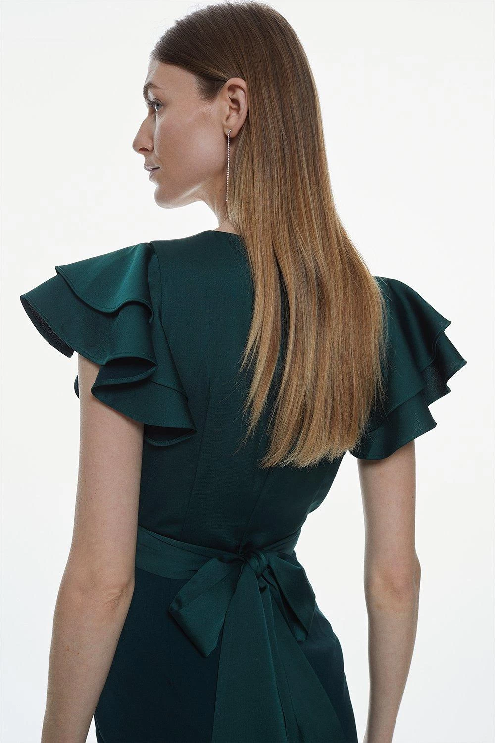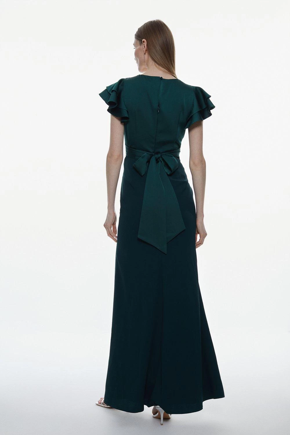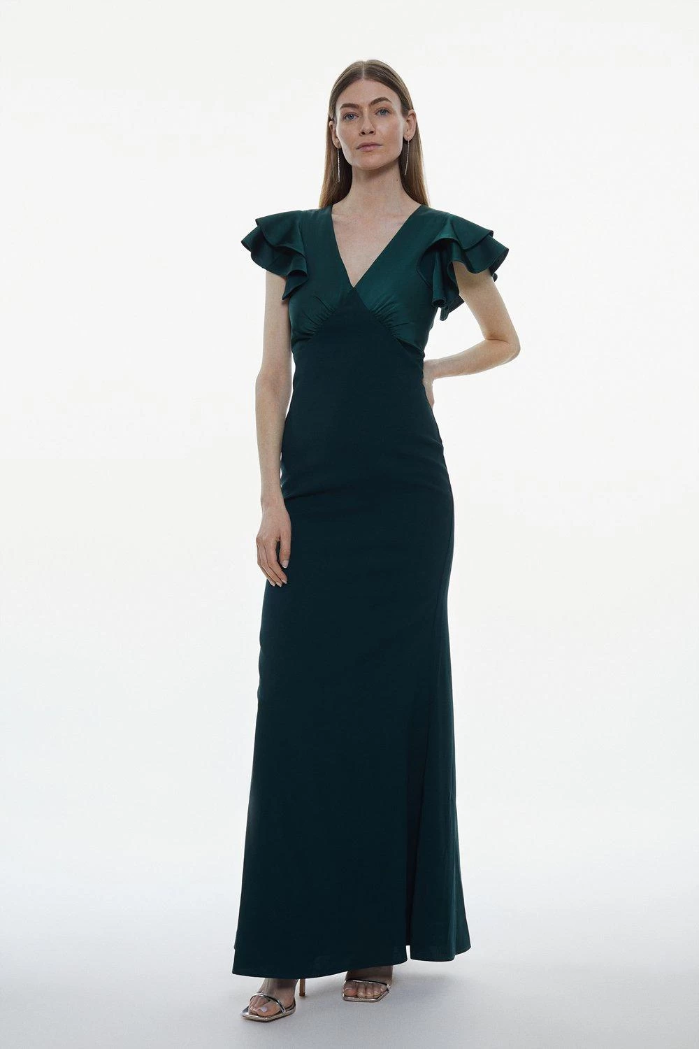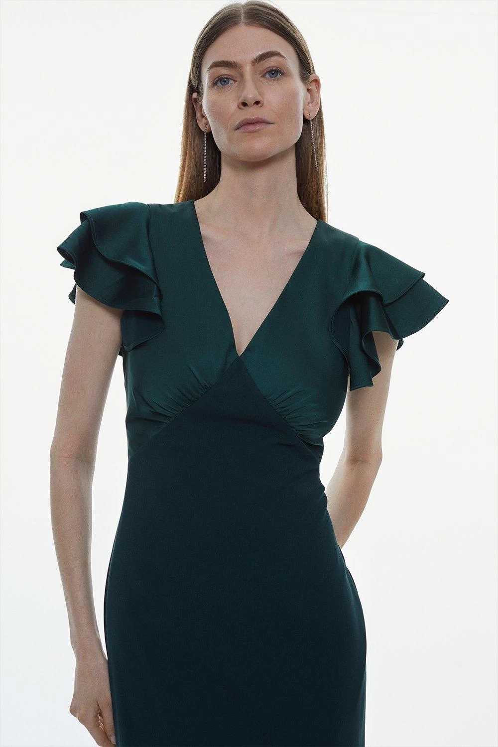 Whether a bridesmaid or wedding guest, this satin dress promises to deliver sophistication to any nuptials. Ruffle angel sleeves add an element of feminine allure, while a fluid silhouette creates an elegant mood. A V-neckline provides the perfect canvas for a dainty necklace, style this piece with heels to complete the look.