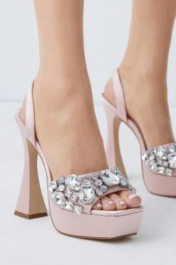 The epitome of feminine glamour, these bold platform heels are defined by a flared block heel and glistening claw crystal accents. This shoe is secured by a sling back strap.