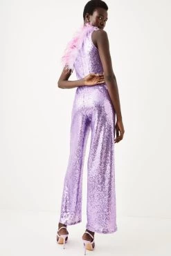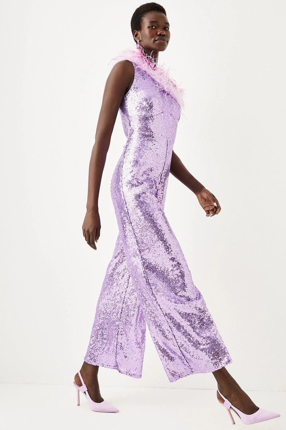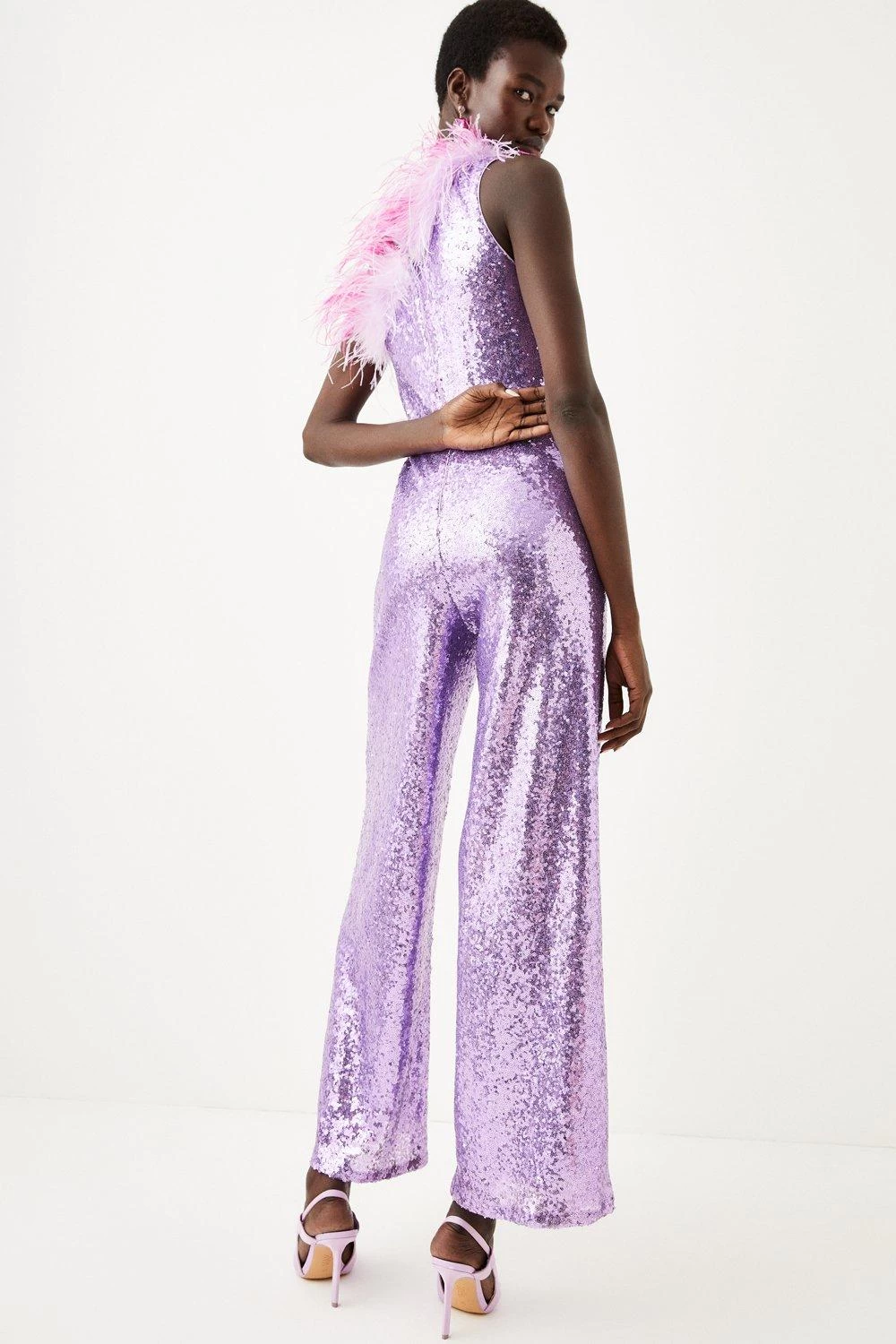 Playful dimensions make for a scintillating foray into after-dark aesthetics. This jumpsuit is defined by the ombre plumes of feathers to the asymmetric neckline, contrasting by an embellished wide leg silhouette.