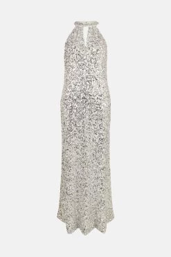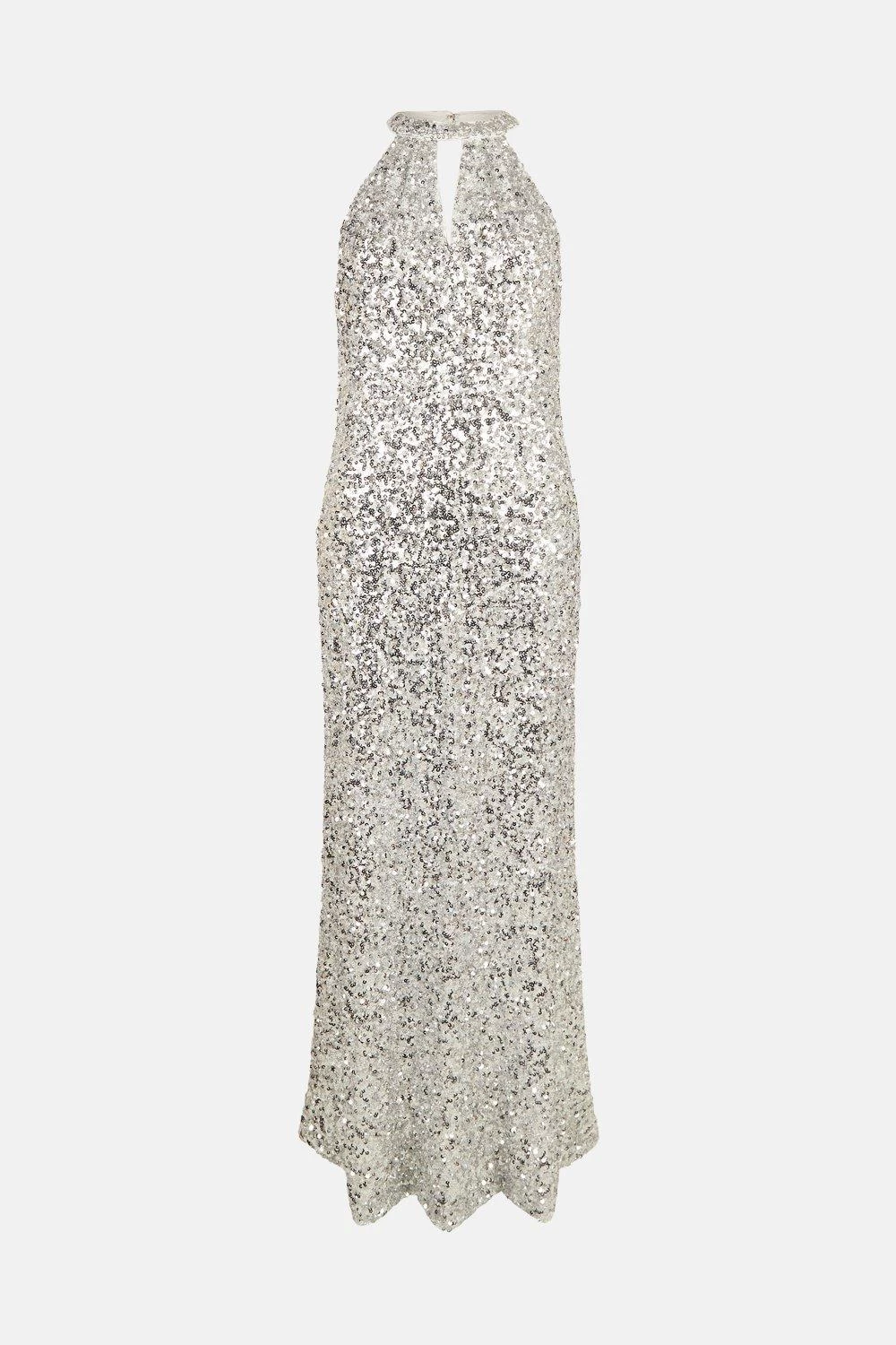 Ready to steal the spotlight? Draped to a dramatic, floor-sweeping length and sparkling all over with light-catching sequins, this stunning maxi dress is the perfect plus-one for NYE. It shows off a sultry front cut-out, halter neckline and skin-baring back for the ultimate flirtatious finish.