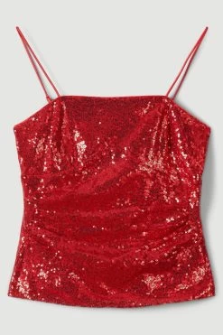 Match the midnight sky with this scintillating camisole top. Artfully composed with a fit and flare form, it’s enlivened with the rich dimension of sequins – calling to be paired with slick leather and soaring stilettos.
