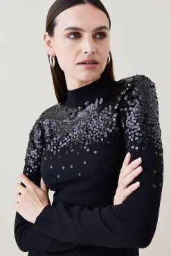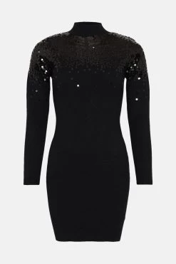 Update your curation of classics with this scintillating iteration of the classic mini dress. Appearing with a dimensional sequinned neckline, this knitted piece has a close fit.