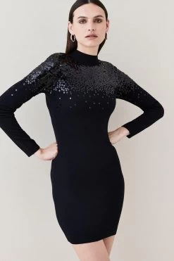 Update your curation of classics with this scintillating iteration of the classic mini dress. Appearing with a dimensional sequinned neckline, this knitted piece has a close fit.
