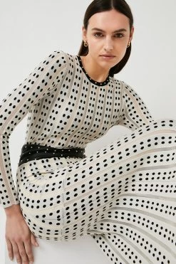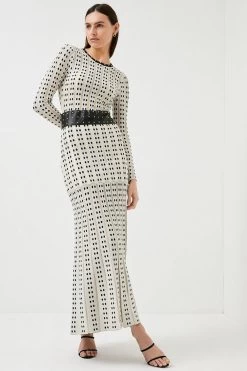 This high-fashion maxi dress is created in a stiff fabric with black polka dots that, interjected with strips of sheer mesh. The body is lined to create a structured form while the sleeves and lower skirt remain unlined for a softened silhouette. The figure-hugging body is further defined by a wide black leather waistband with metal studs, which are repeated around the neckline. The skirt moves and fans out dramatically in a latticed style. Pair this elegant piece with simple strappy heels and cuff bracelets.