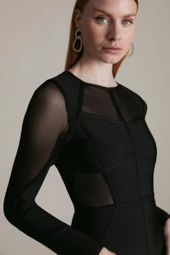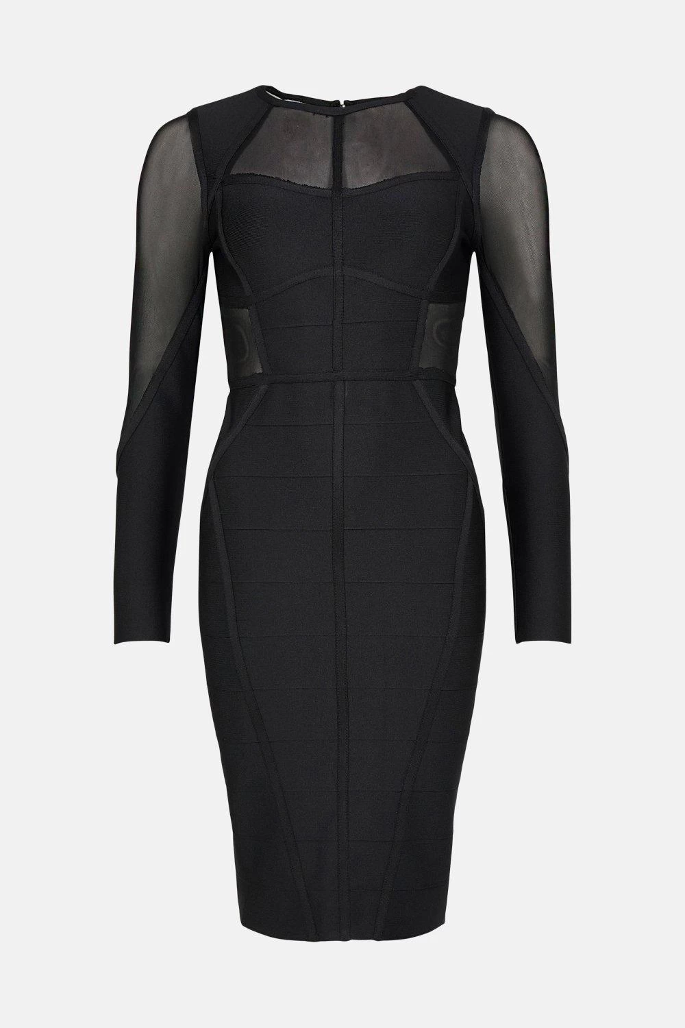 Sultry sheer panels lend this panelled bandage dress a vampy twist. Perfect for special after-dark occasions, its long sleeves and curve-contouring silhouette provide endless sartorial drama.