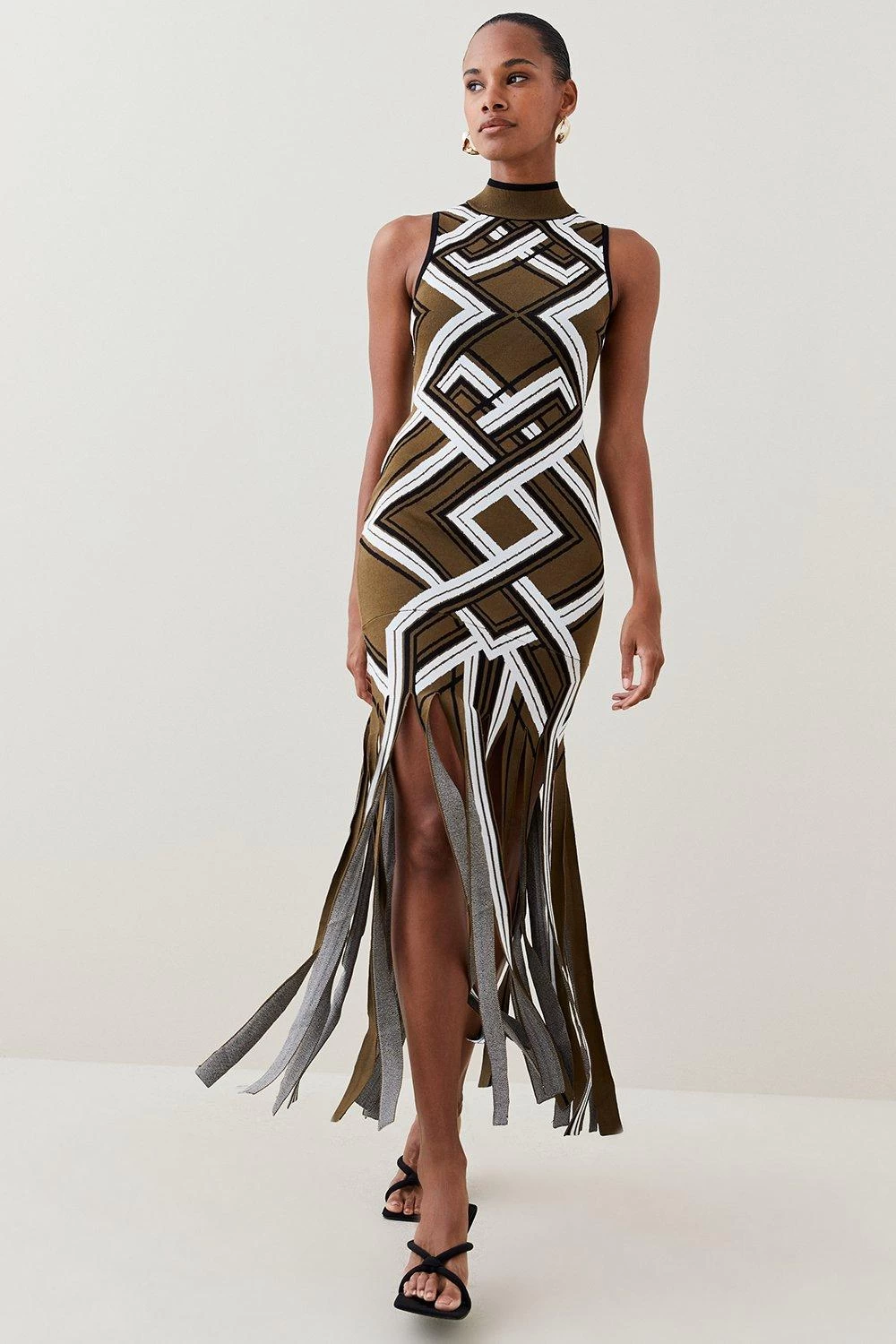 Spliced at the hem for a truly unique finish, this form-fitting knitted dress swishes elegantly as you move. It features a sporty high neckline and sleek, sleeveless fit that keeps all eyes on the bold placement print and seductive, curve-skimming silhouette.