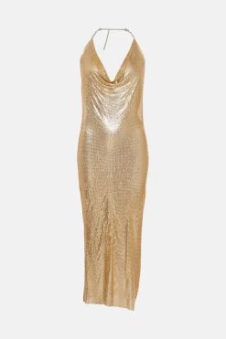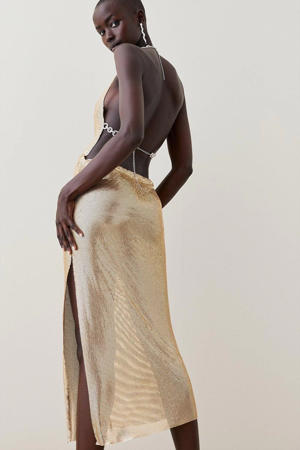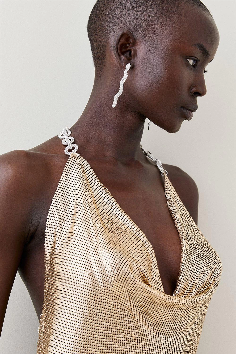 Flowing with molten modernity, this chainmail dress is a tactile and timeless showstopper. Composed with after-dark reverence, this languid piece flows from chain straps for an industrial-imbued finish.