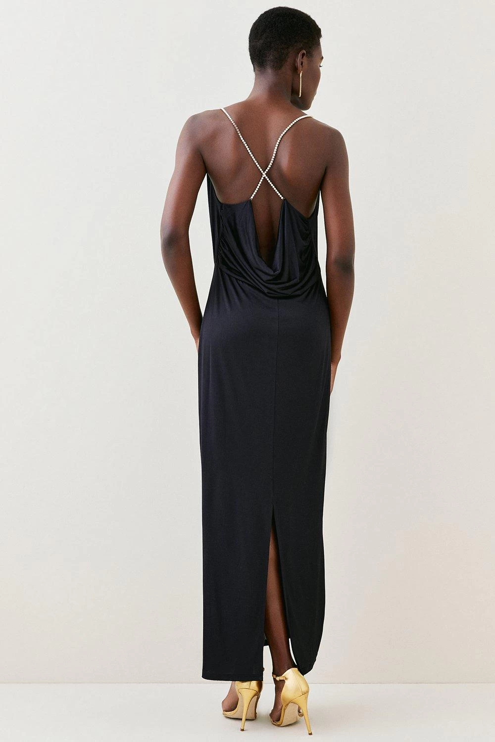 Draping dreamily over the form, this slinky jersey maxi dress was designed to enhance and accentuate feminine curves. It features slender, diamante-detail straps that cross over elegantly at the shoulder along with a draped cowl neckline and column-style skirt. Cut with a sultry hem split, it adds a sense of drama to black-tie balls and other special soirees.