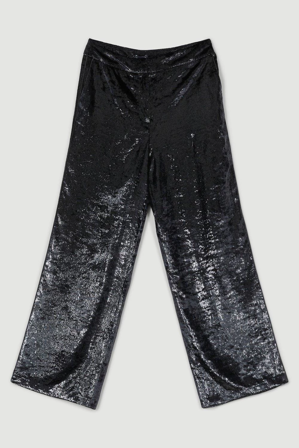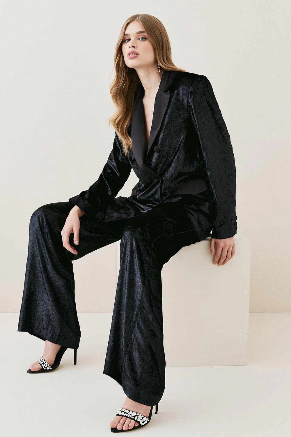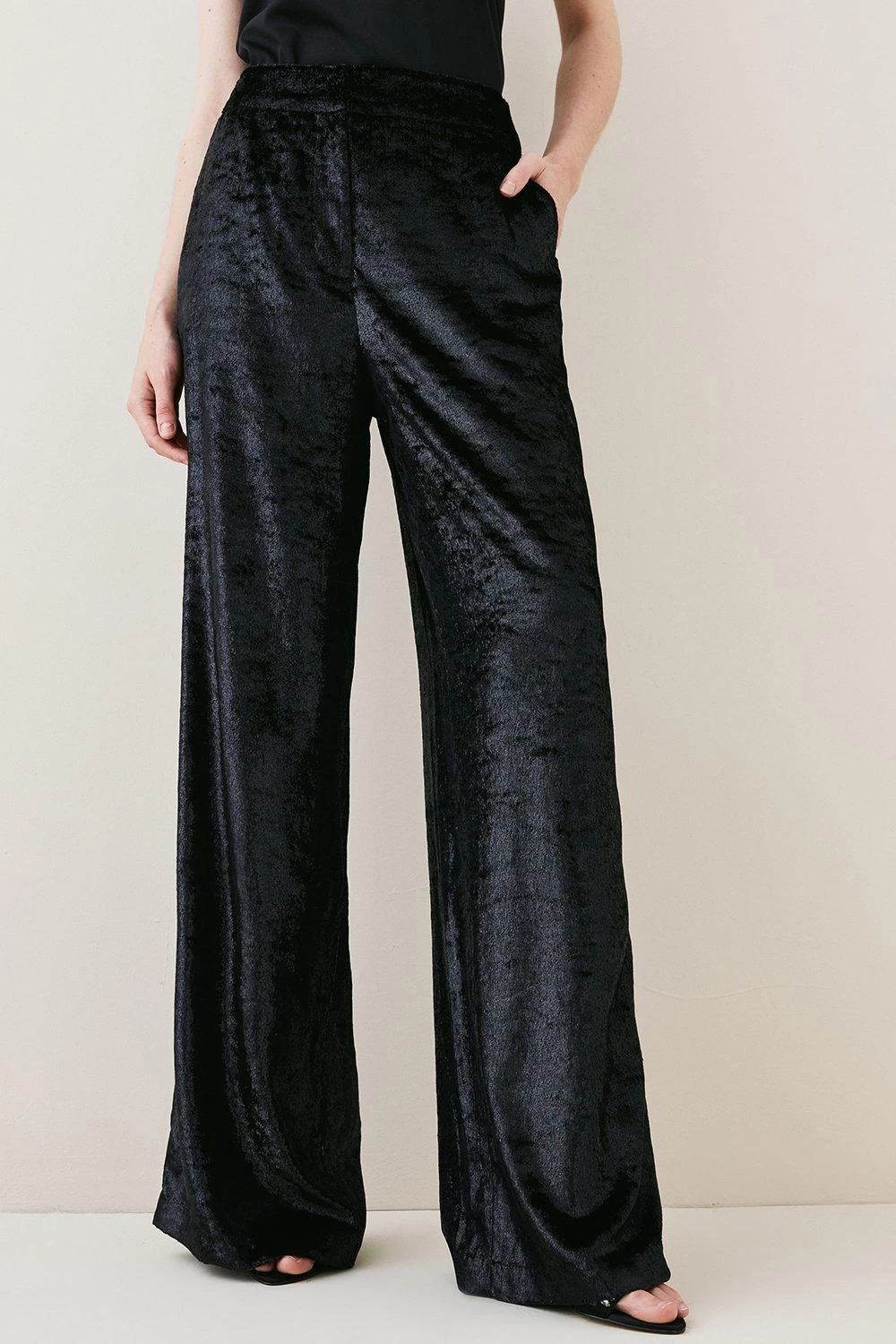 Slinky velvet drapes with languid ease over the form for these elegant wide-leg trousers. Appearing with a high-rise waist that defines the form before flowing into the length, pair with the matching blazer for a streamlined finish.