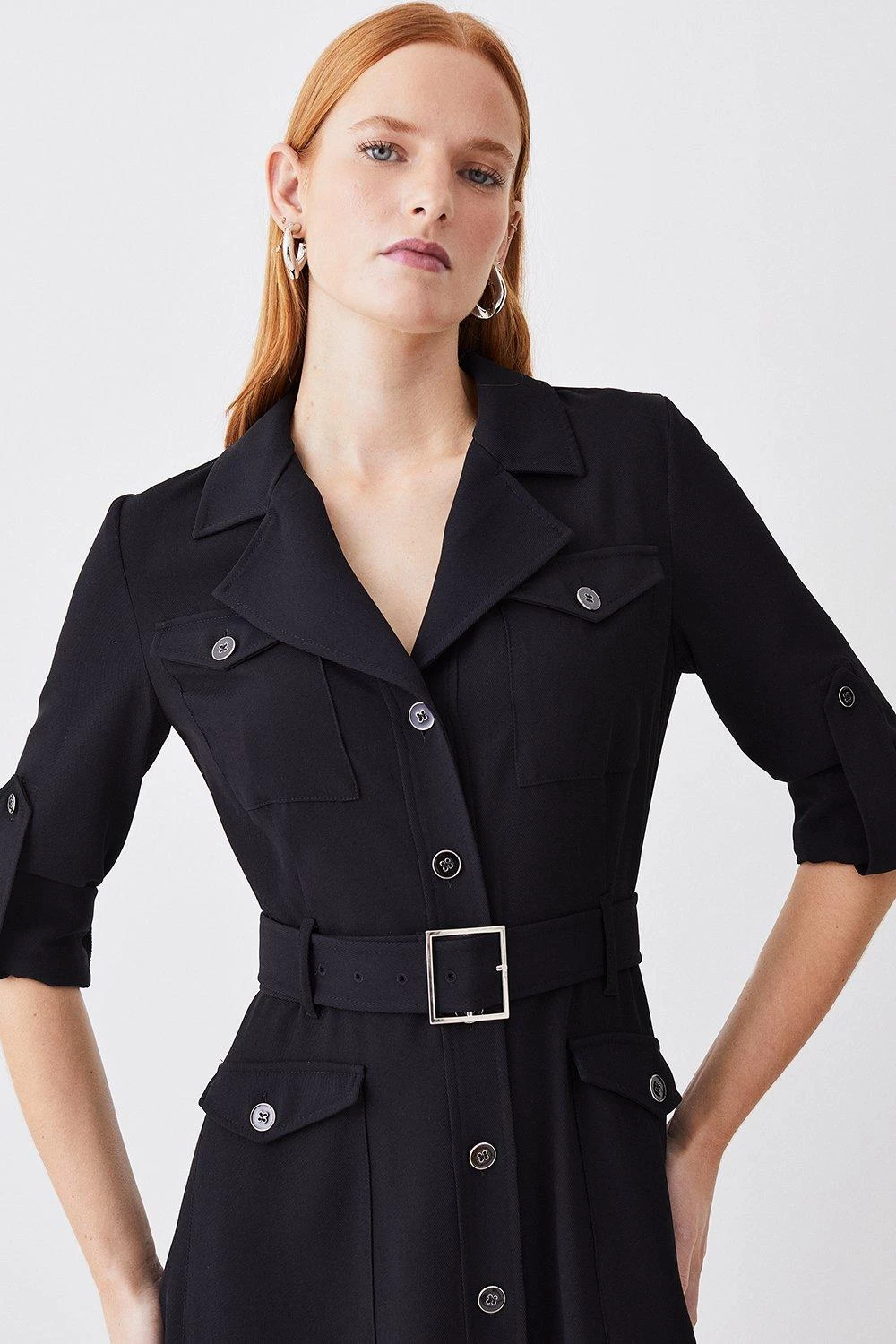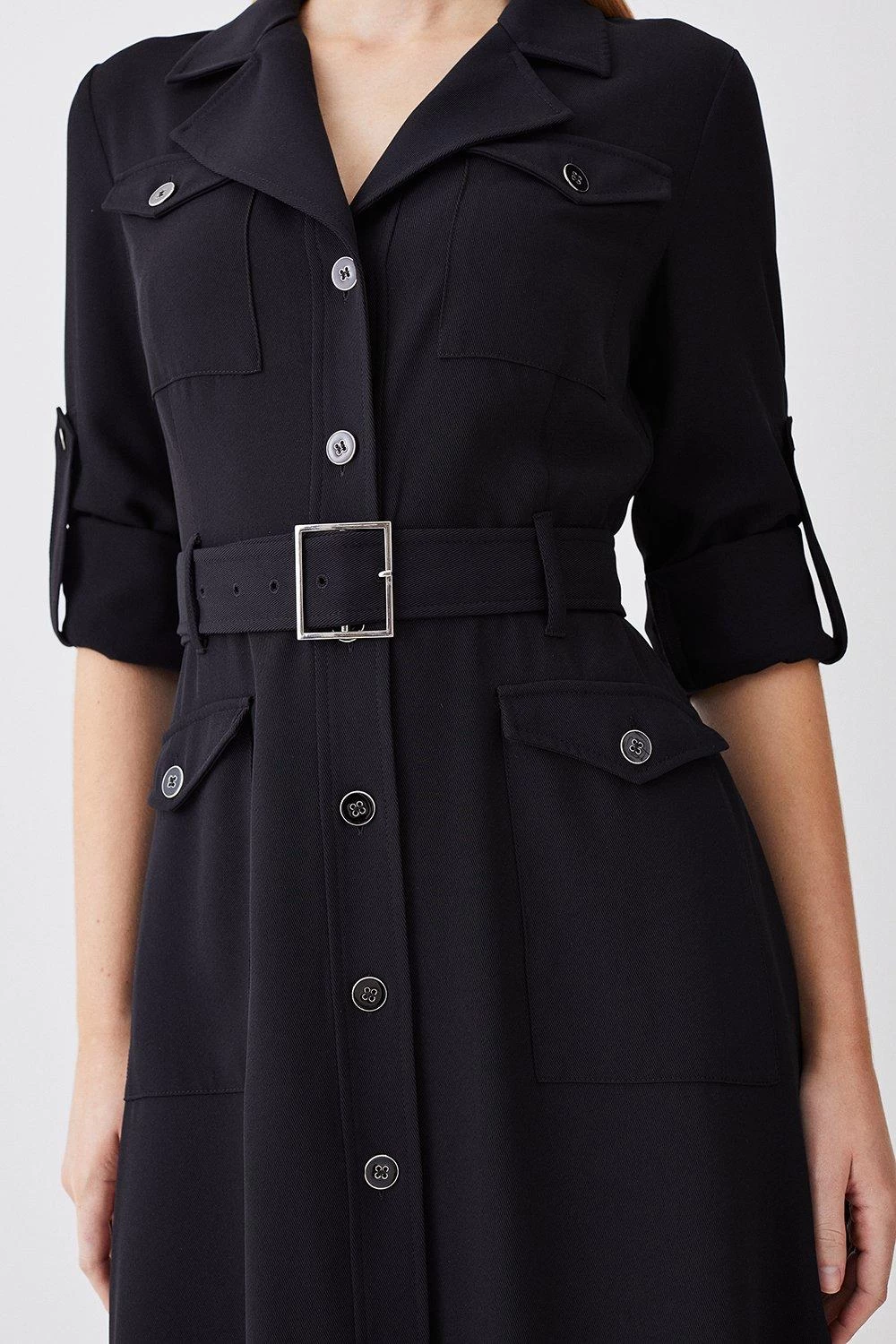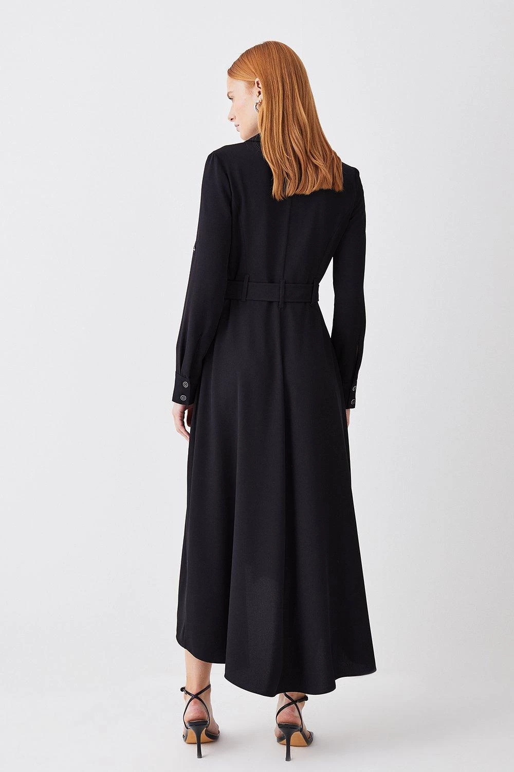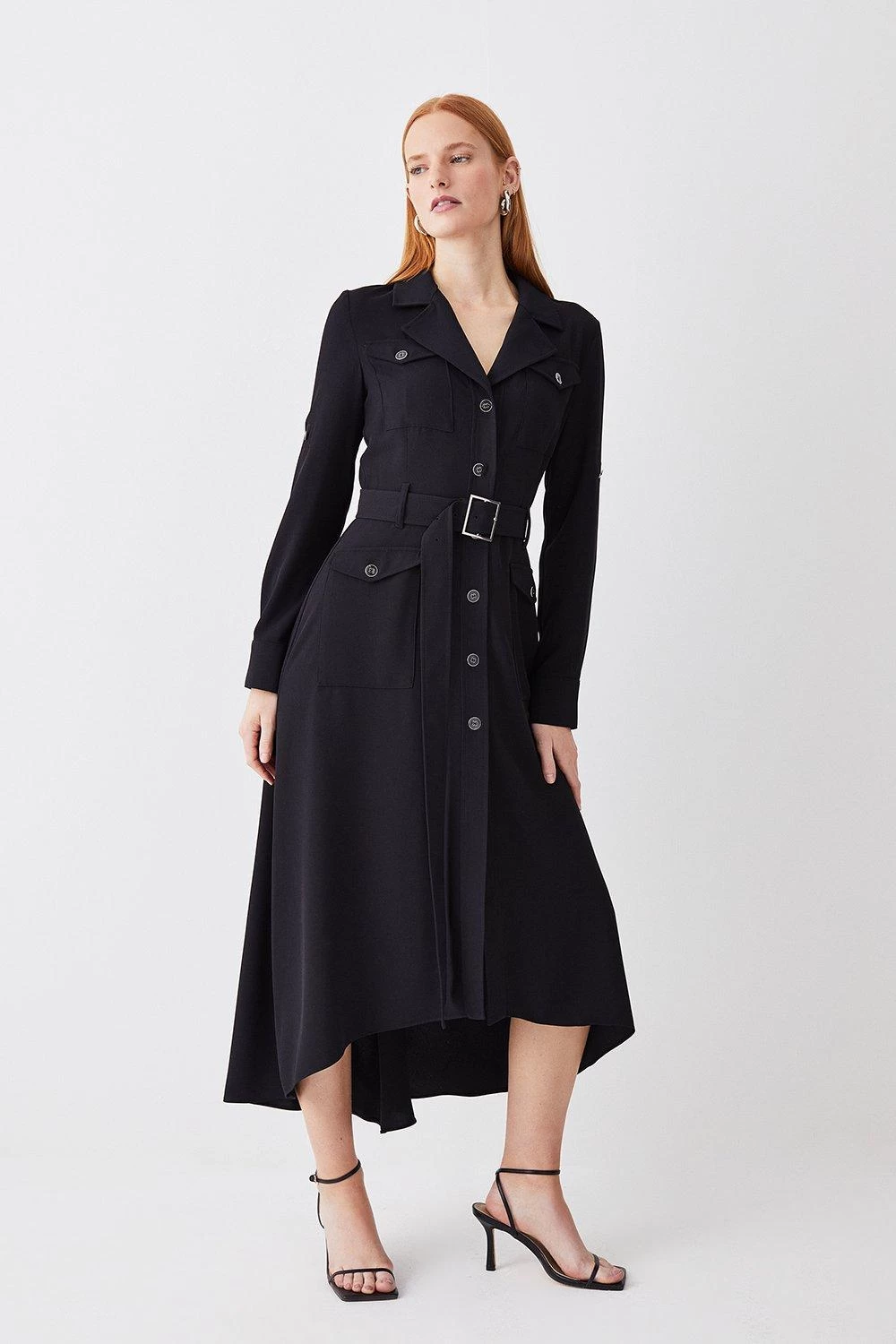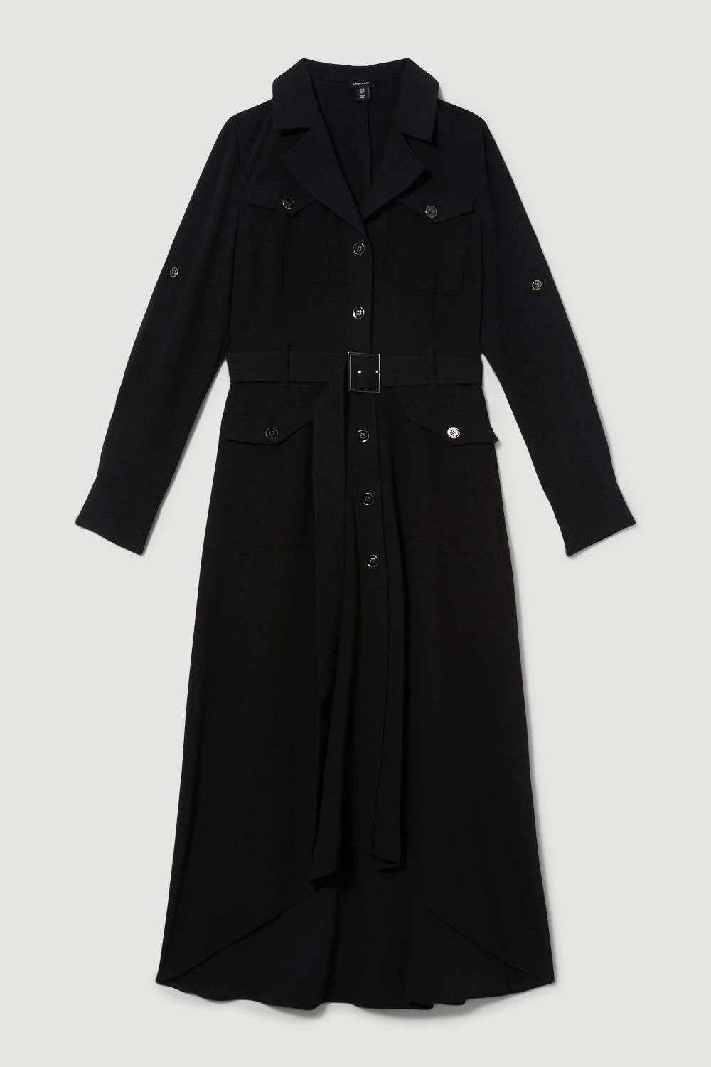 A wardrobe staple with timeless appeal, this utility-style shirt dress offers effortless sophistication. A buckle belt helps to outline the silhouette, while the fluid skirt flares out in a high-low design. Polished buttons add a sleek finish.