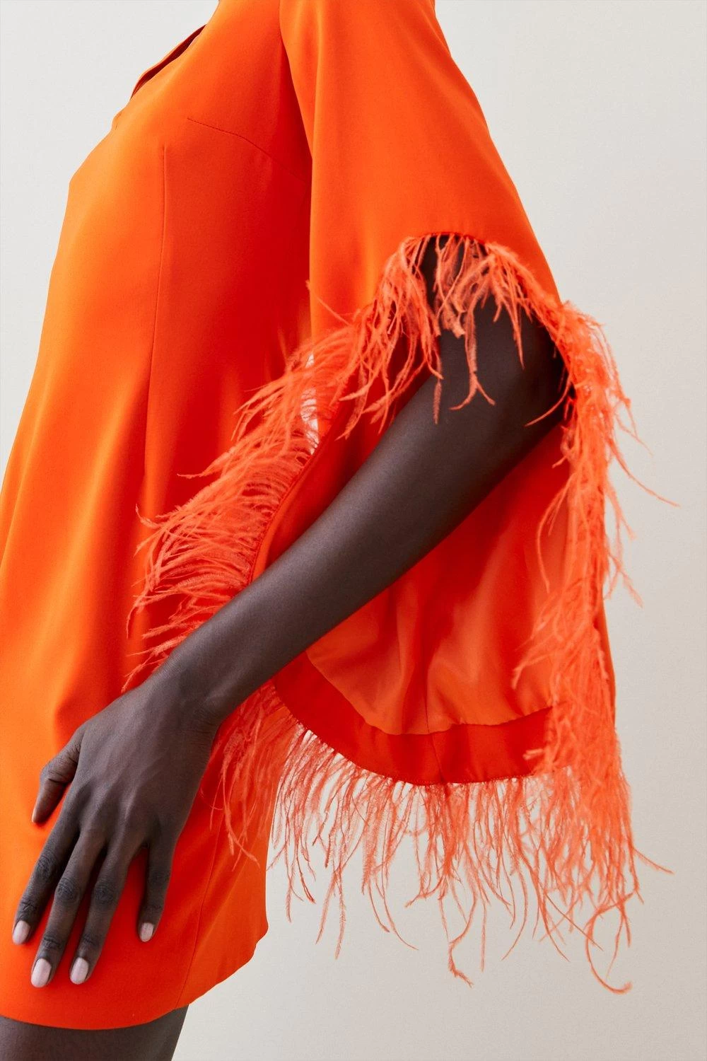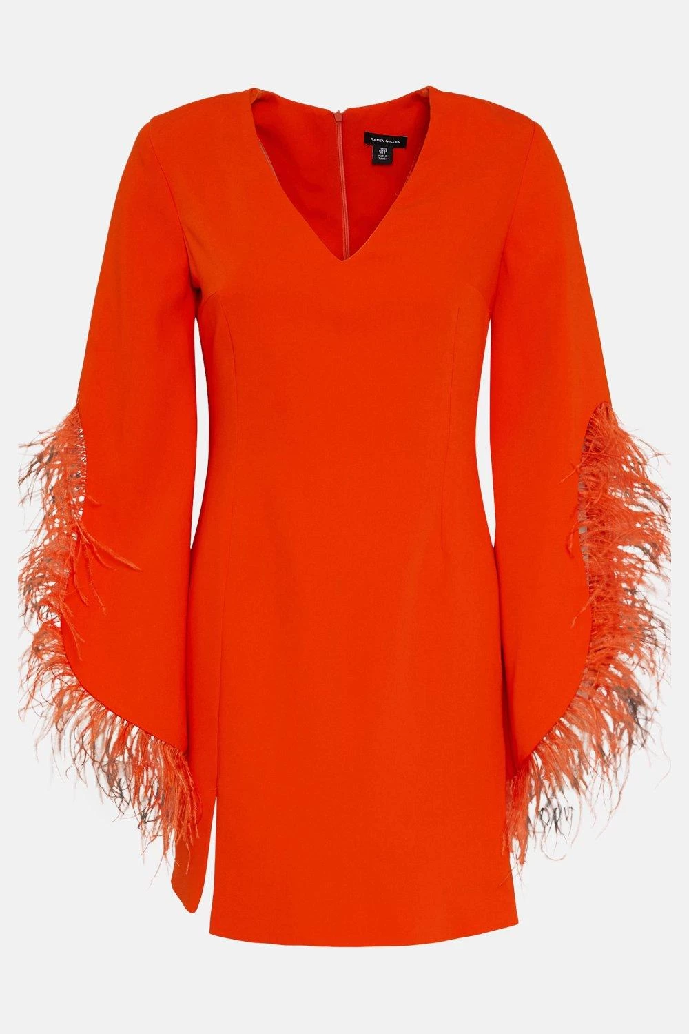 Bring the summertime drama in this colour-pop tailored dress. Emboldened by its dramatic feather-fringed sleeves that trail down alluringly, this opulent V-neck design is sure to turn endless heads at your next summer party. Add to its leg-lengthening appeal with strappy nude heels for after-dark.