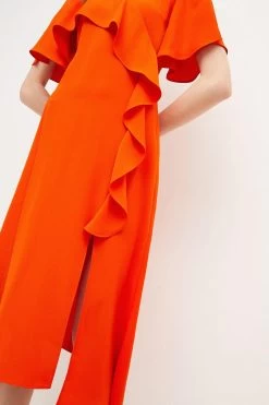 Romantic ruffles are sharpened with effortless tailoring for this dimensional midi dress. Draping the body with soft jersey for a statuesque finish, it’s defined by a frilled neckline and floaty short sleeves with split cuffs. Fitting the bodice before falling to a split skirt, pair with gold stilettos and oversized hoops for statement-making magic at summertime soirées.