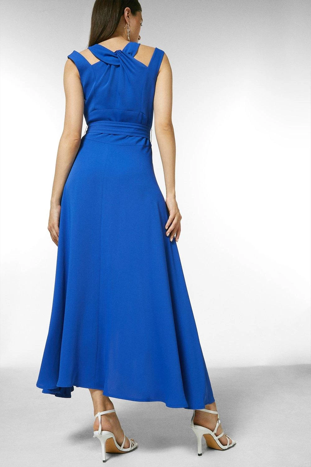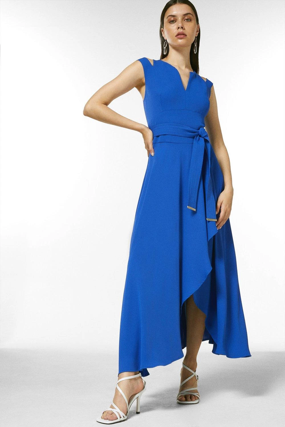 Softly tailored to the contours of your frame, this dress embraces your feminity in all its glory. Drawing attention to your bust using a V-neck bodice, the twisted back offers a further glimpse of skin in style. Cascading ruffles beautifully drape down the wrap-over skirt, while cut-out accents offer a directional feel. The piece comes complete with a self-tie belt so you can control the fit as you desire.