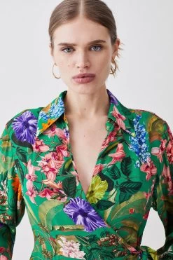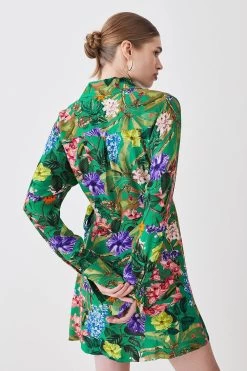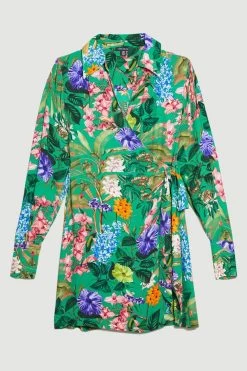 Embody the spirit of summer in this vibrant wrap mini dress. Inspired by a tropical rainforest, this piece is enlivened with vivid hues and floral motifs. A wrap design naturally flatters the form, while a mini hemline gives this dress warm-weather appeal.
