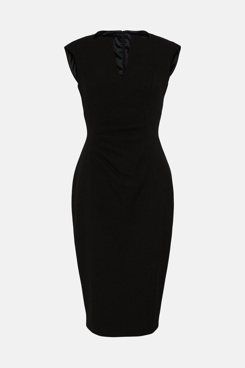 Statuesque in its Structured Crepe composition, this midi dress appears with polished reverence. Framed by the exaggerated depth of a notched neckline, it has artful draping to the bodice for a dimensional finish.