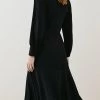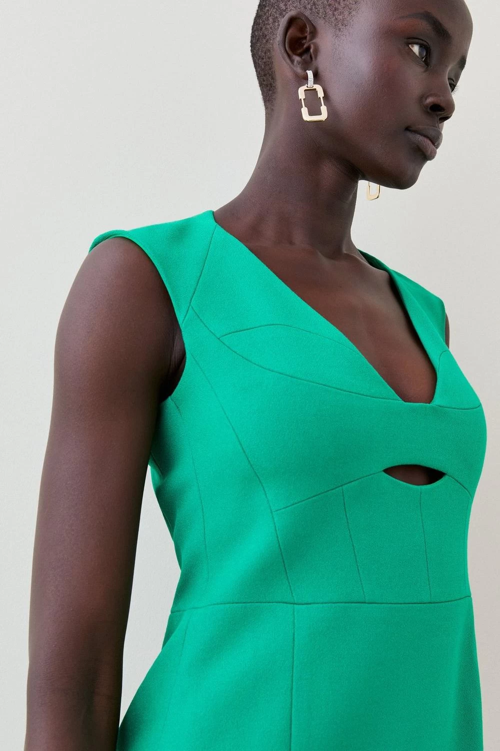 This pencil dress is crafted with structured crepe material for a form-hugging fit. A low scoop neckline adds a sultry touch, further emphasised by a leg slit detail and fashion-forward cut-outs.