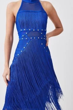 Karen Millen Studded Fringe Mesh Insert Halterneck Bandage Midi Dress