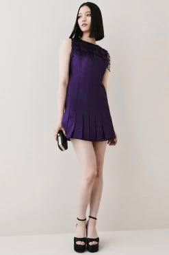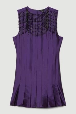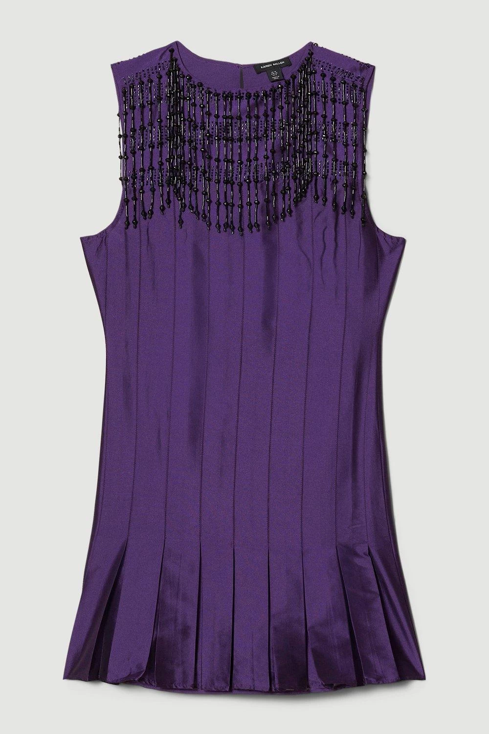 A retro-style piece with a contemporary edge, this mini dress exudes an alluring charm. Featuring decadent beaded tassels and a pleated hemline, this is a truly unique style. Style with block heels for the perfect finishing touches.