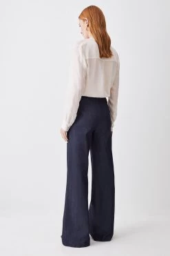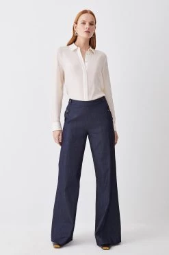 Bring a dose of understated elegance to your capsule collection with these tailored denim trousers. Combining the classic qualities of a tailored wide-leg cut with a denim composition gives this piece an undeniably modern feel. Side slip pockets provide functionality, while signature KM embossed buttons add a premium finish.
